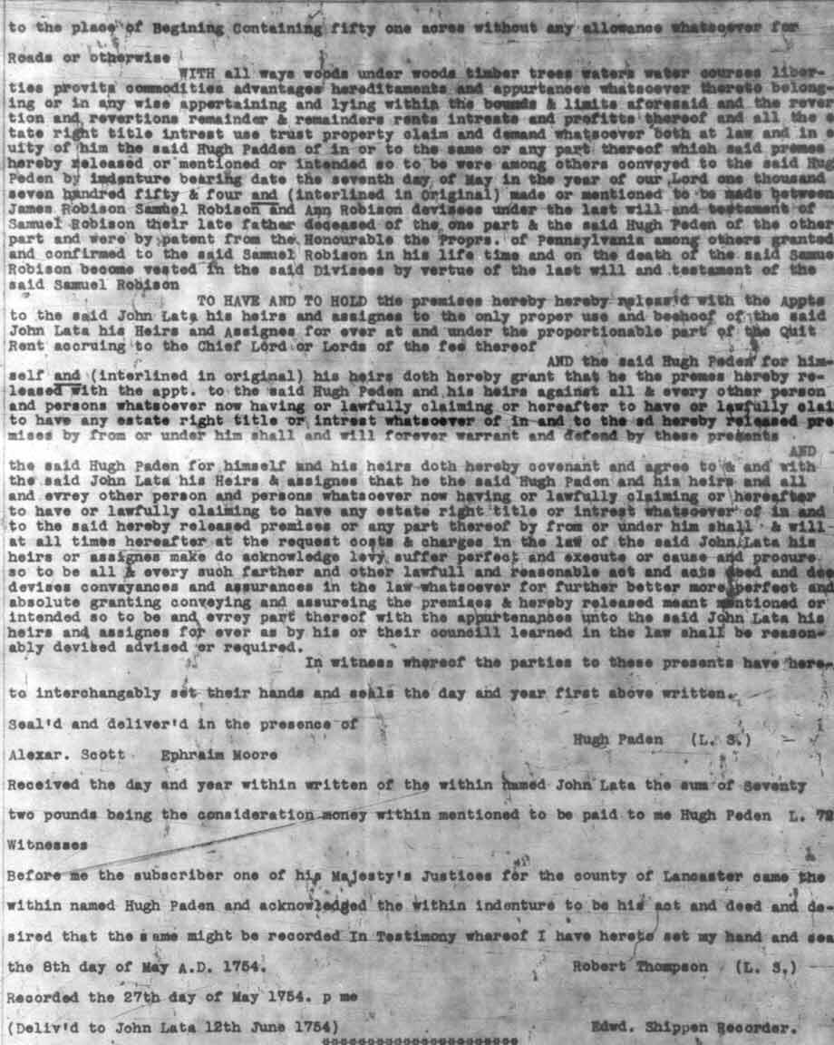 John Lata then bought Samuel Robison's tract of land beside him from Hugh Paden in 1754.