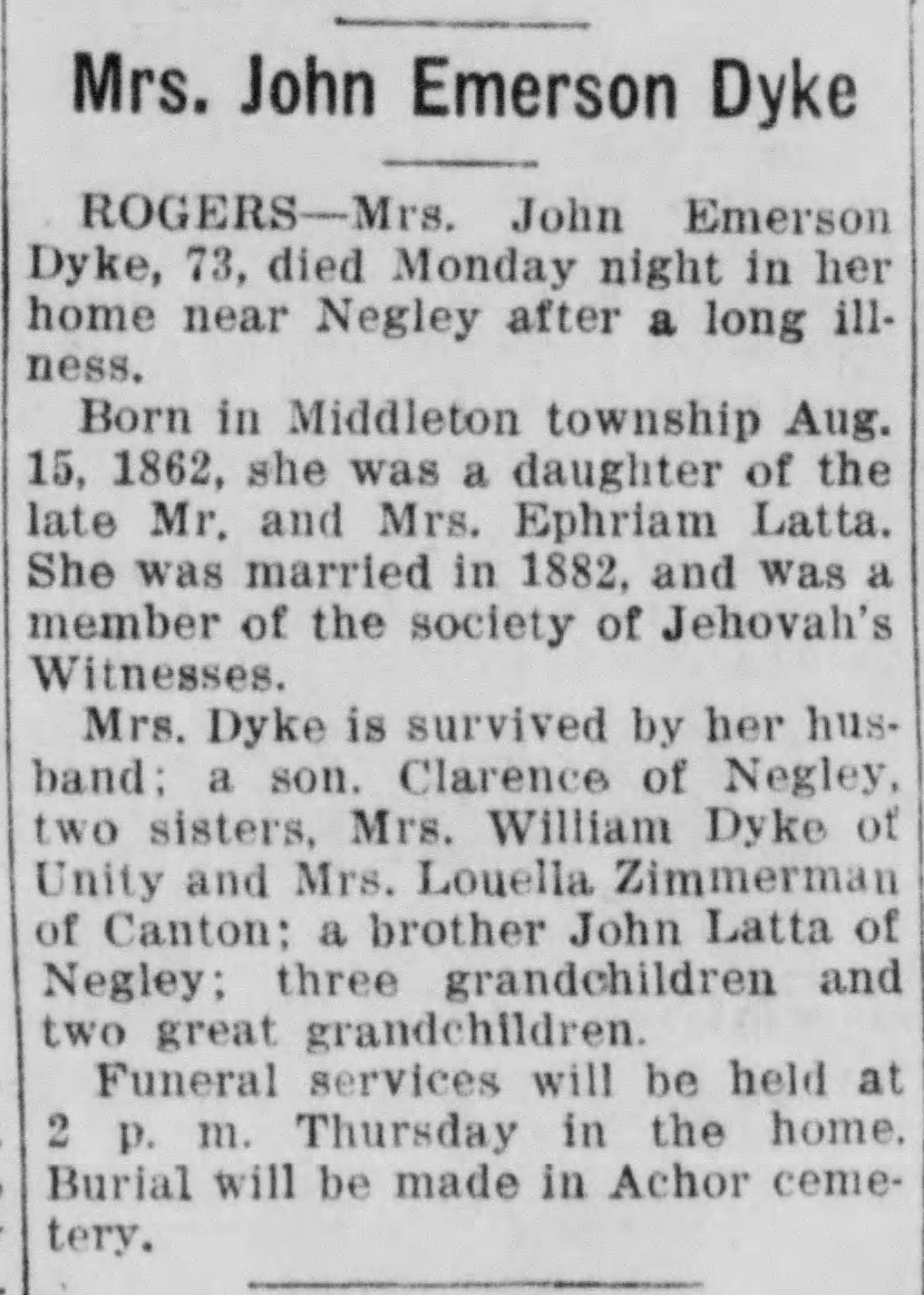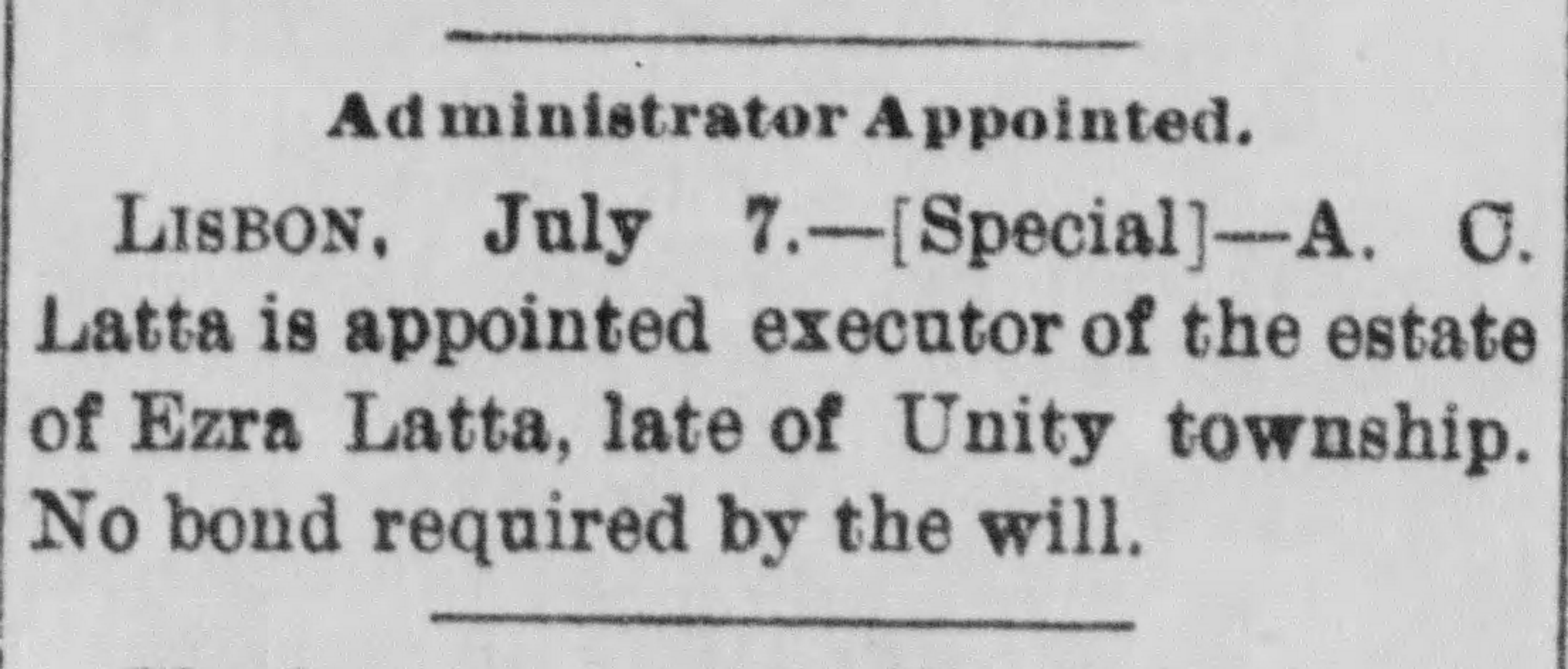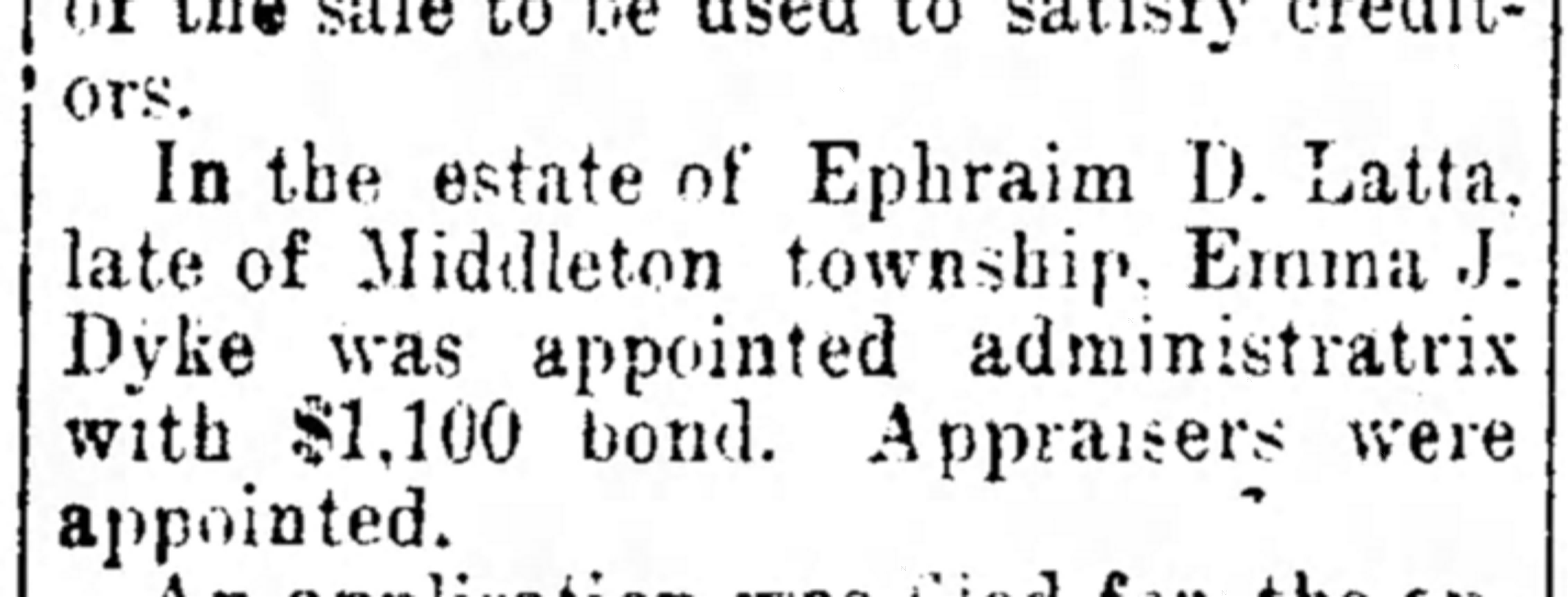 Salem Daily News, Dec. 3, 1896 list the estate of Ephraim D. Latta, naming his daughter Emma J. Dyke as administratrix. Notice the middle names are not matching. |