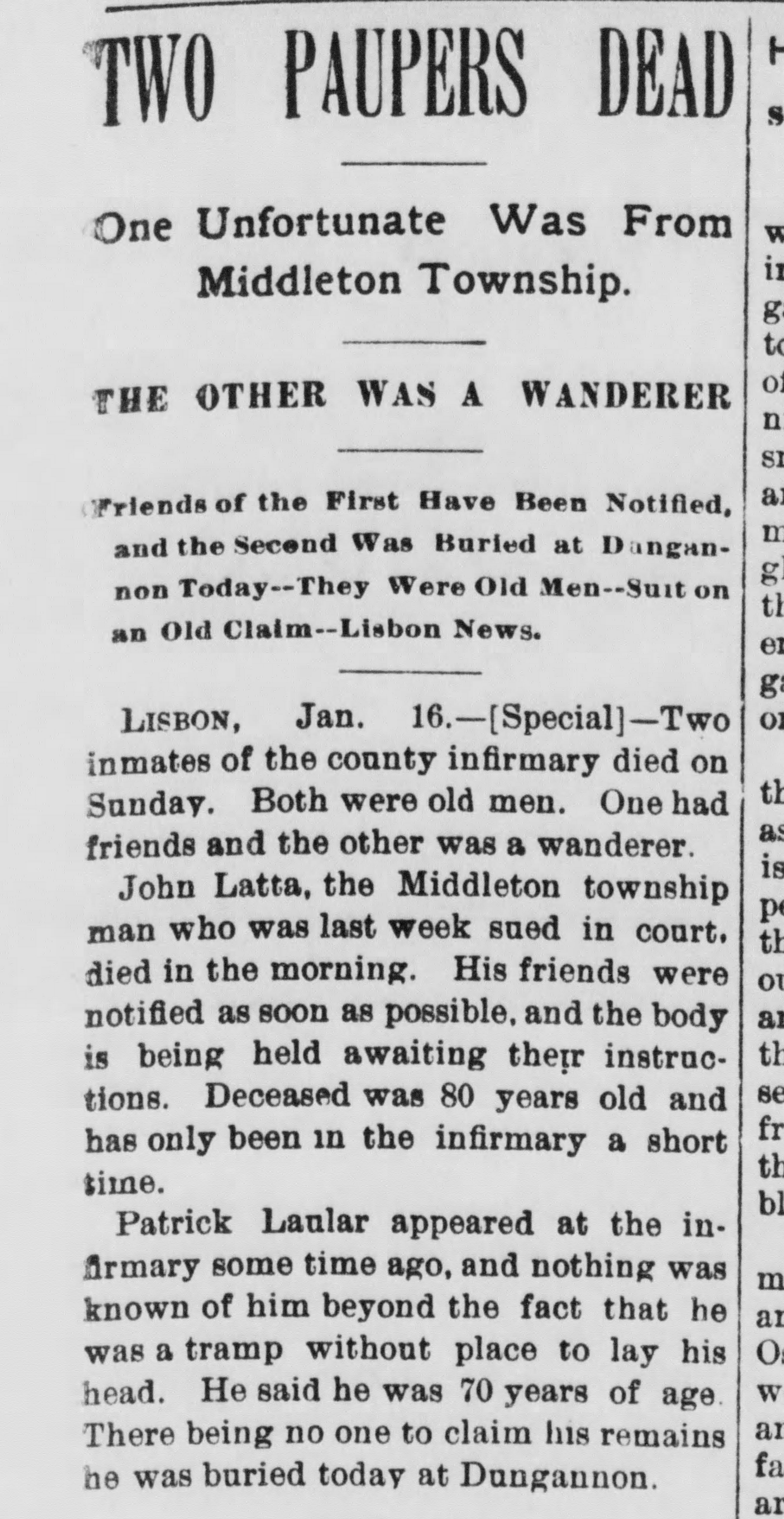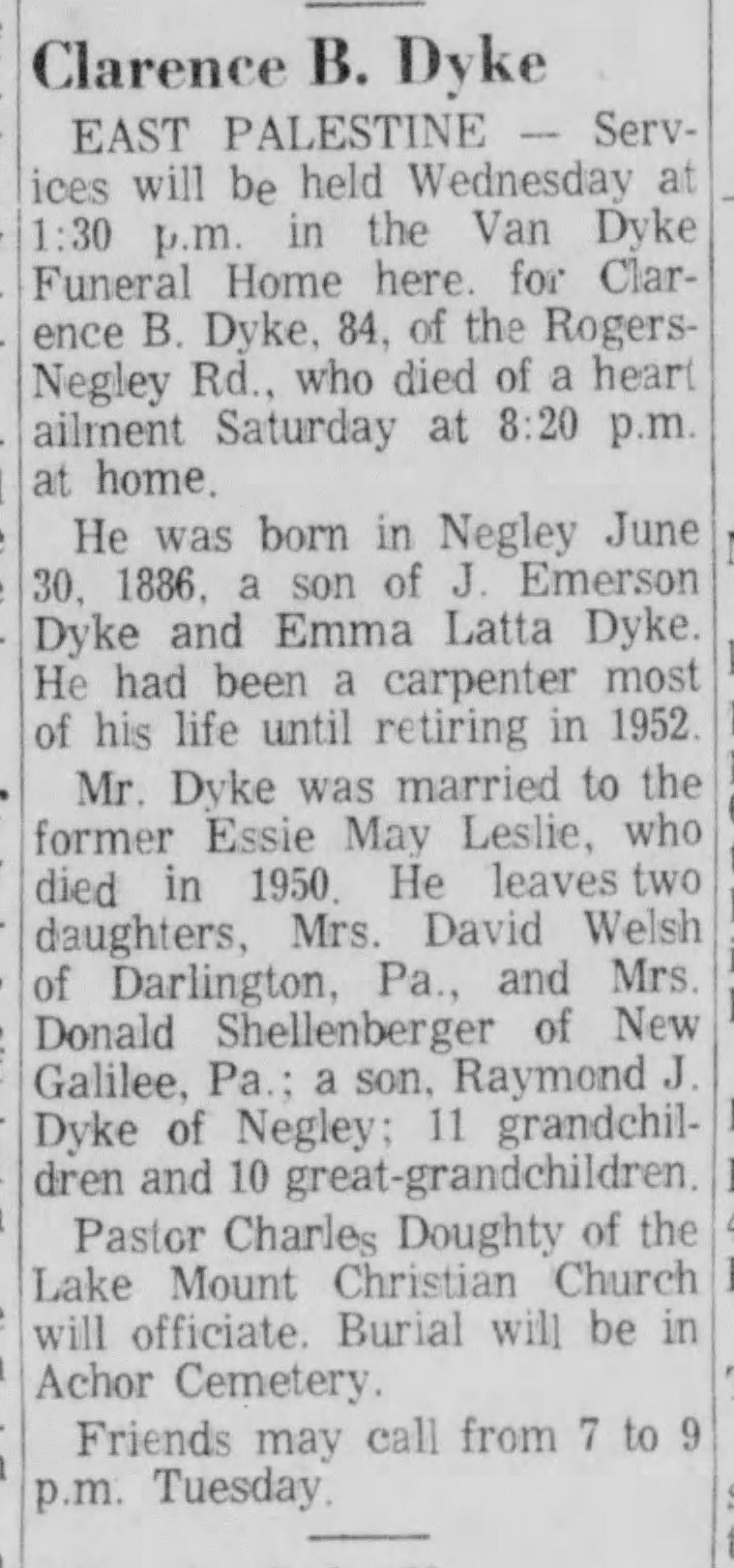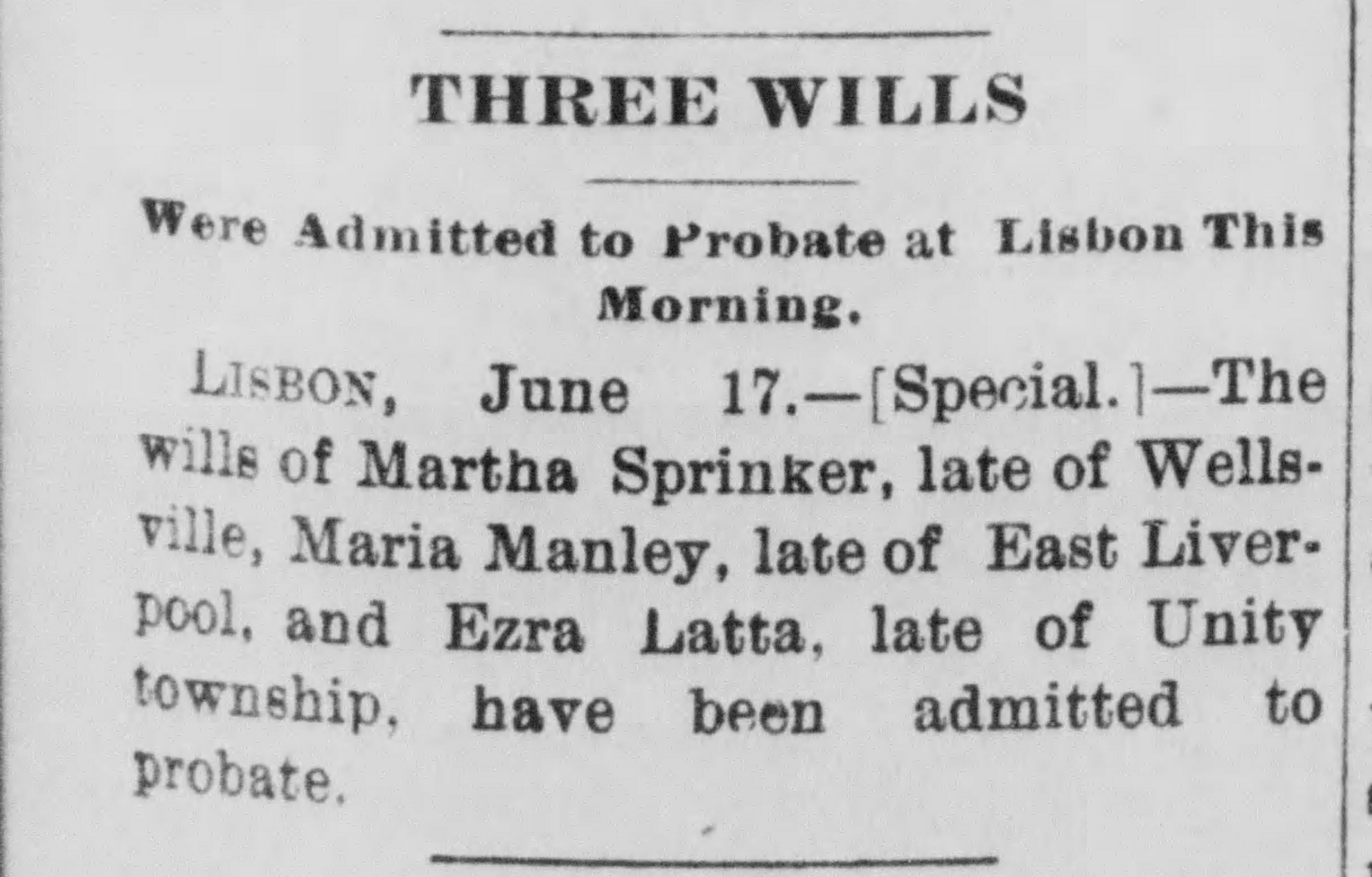 Salem Daily News, Dec. 3, 1896 list the estate of Ephraim D. Latta, naming his daughter Emma J. Dyke as administratrix. Notice the middle names are not matching. |