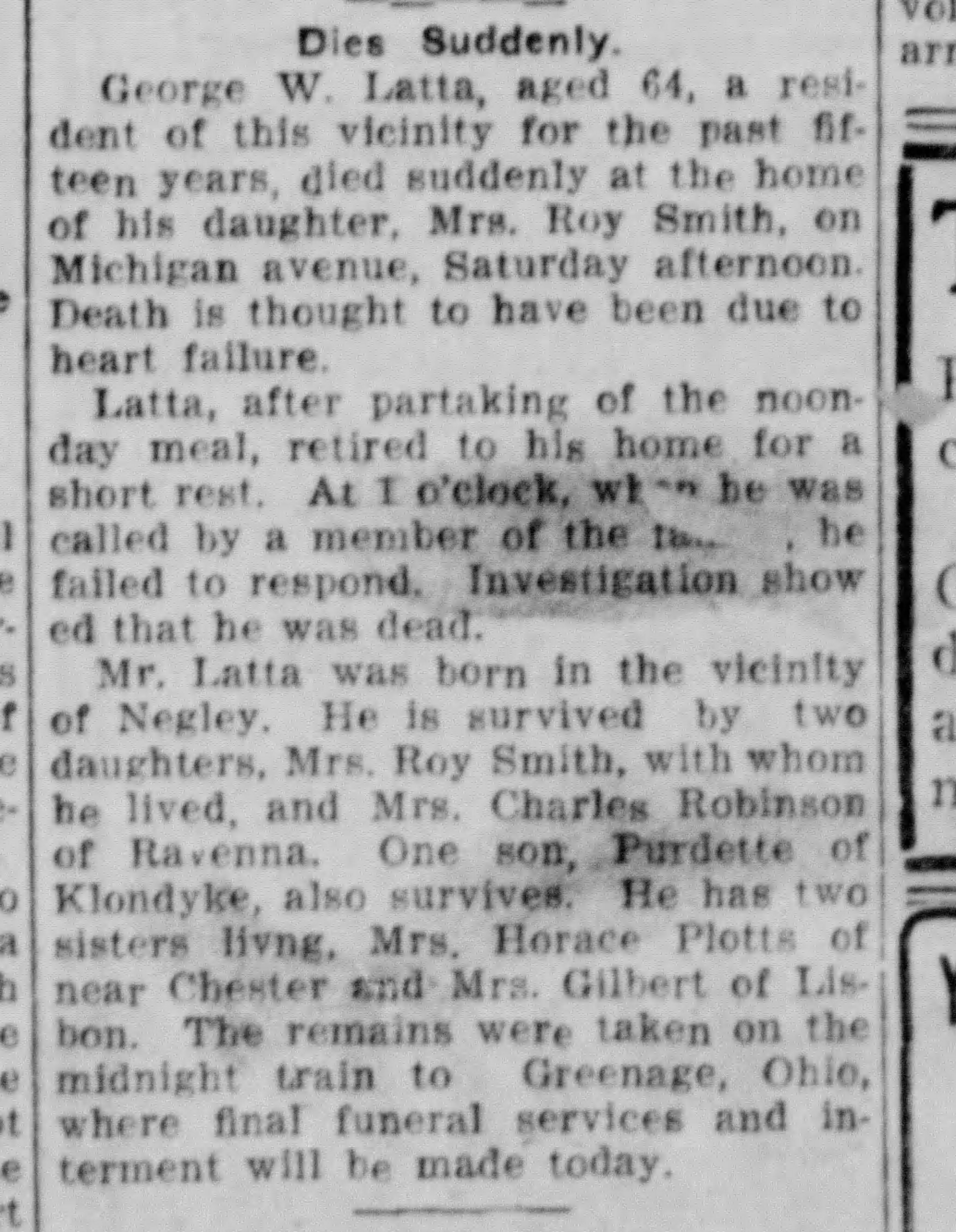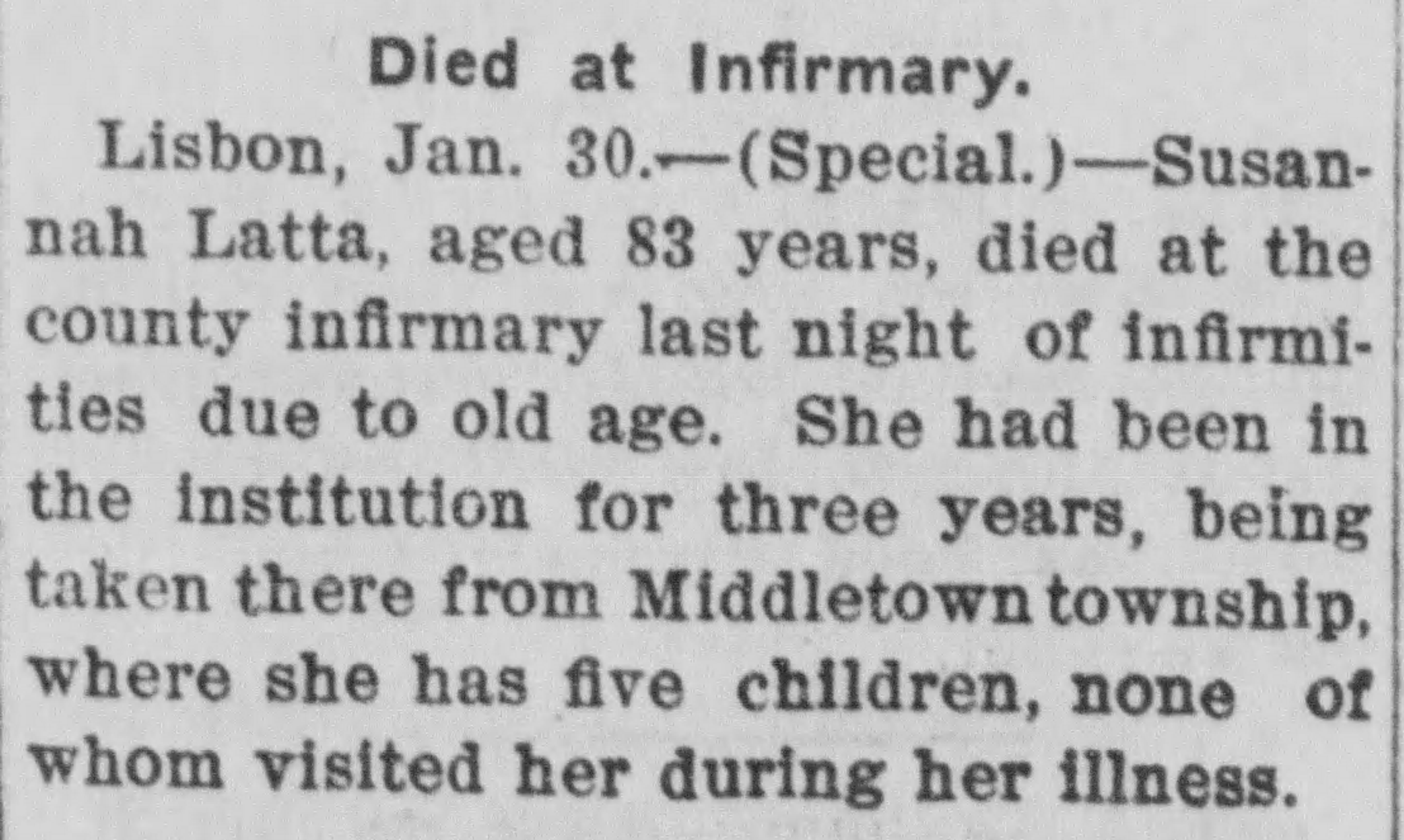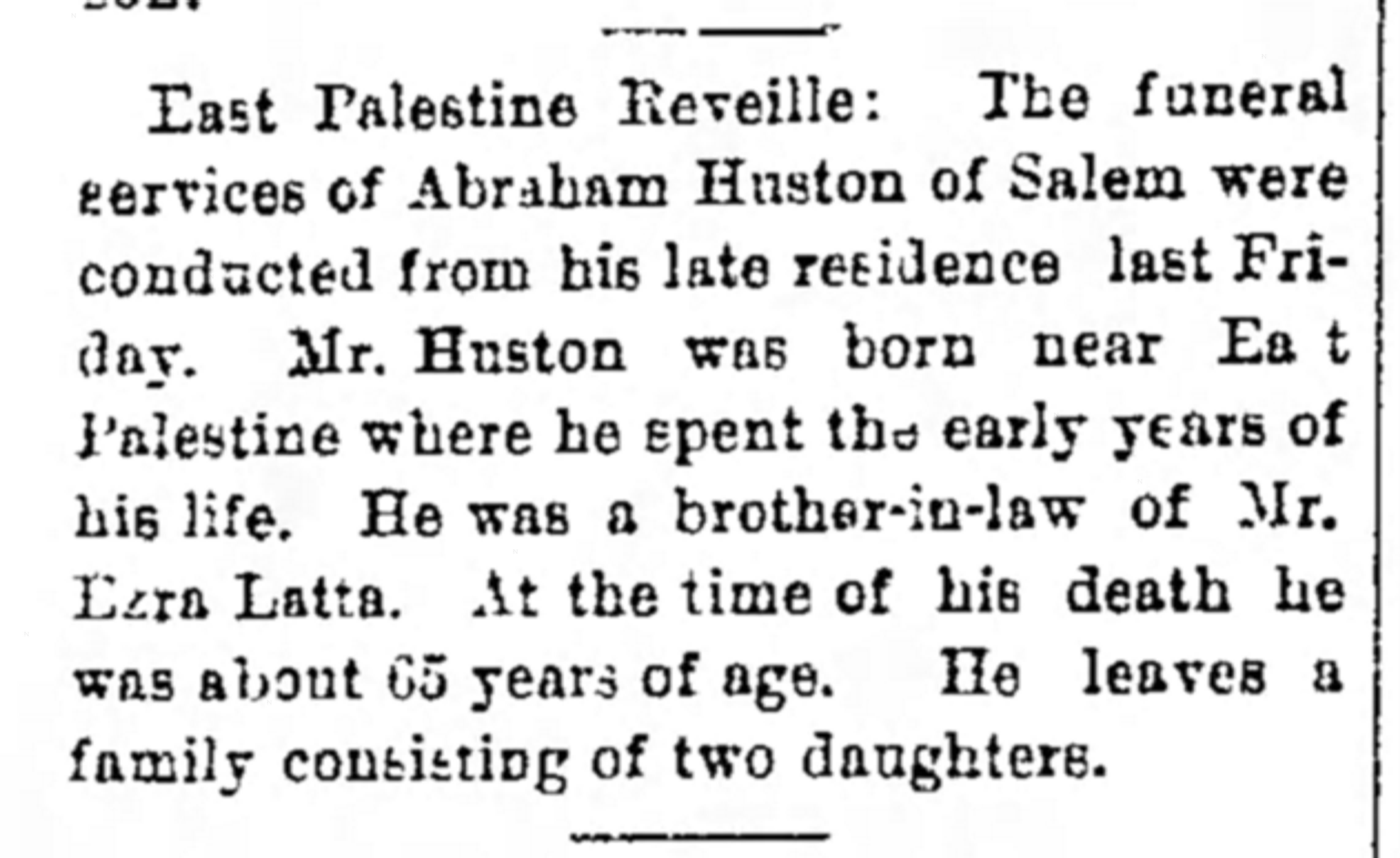 "History of the Upper Ohio Valley, Volume 1" page 276 - Ezra Latta, one of the enterprising business men of Unity Township, was born in Beaver County, Pennsylvania, being one of two sons born to John Latta and Mary (Rhinehart) Latta. The father was a Pennsylvanian. He afterwards located in Ohio, and later in Illinois, where he died. His widow again married and had six children by her second husband. She finally returned to Ohio, and died in Middleton township in 1875. The other son of her first marriage was John Latta. Ezra was educated in an old log school house, known as the New Ridge School-house. Subsequently, he learned the milling business, having been apprenticed to a man who operated a flour-mill at Old Falston, Beaver County, Pennsylvania. After completing his apprenticeship, he removed to Columbiana County, Ohio, and rented a mill of John Crum, which he operated for ten or twelve years, when he was obligated to abandon the business on account of failing health. At this time, Mr. Latta removed to Western Ohio, and thence to Michigan and Indiana, and for several years was located at Fort Wayne. In the course of time he returned to his old home, and finding that the mill had changed hands, decided to purchase it. The man who was operating the mill offered him one-third of the profits for his services, which he accepted. Subsequently, he engaged in farming, and has since continued in that vocation. In 1844 he married to Miss Mary Huesten (Houston), daughter of Abram and Mary Huesten, who at that time were residents of Ohio, but who formerly came from Virginia. Six children are the fruit of this union: Marion C., now of the State of Washington, Webster (deceased), Emma (deceased), Louisa, wife of Joseph Near of southwestern Kansas, and Alonzo Cooper, who lives with his father. Mr. and Mrs. Latta are valued members of the Methodist Episcopal Church of East Palestine, and are held in high esteem by their neighbors and friends.