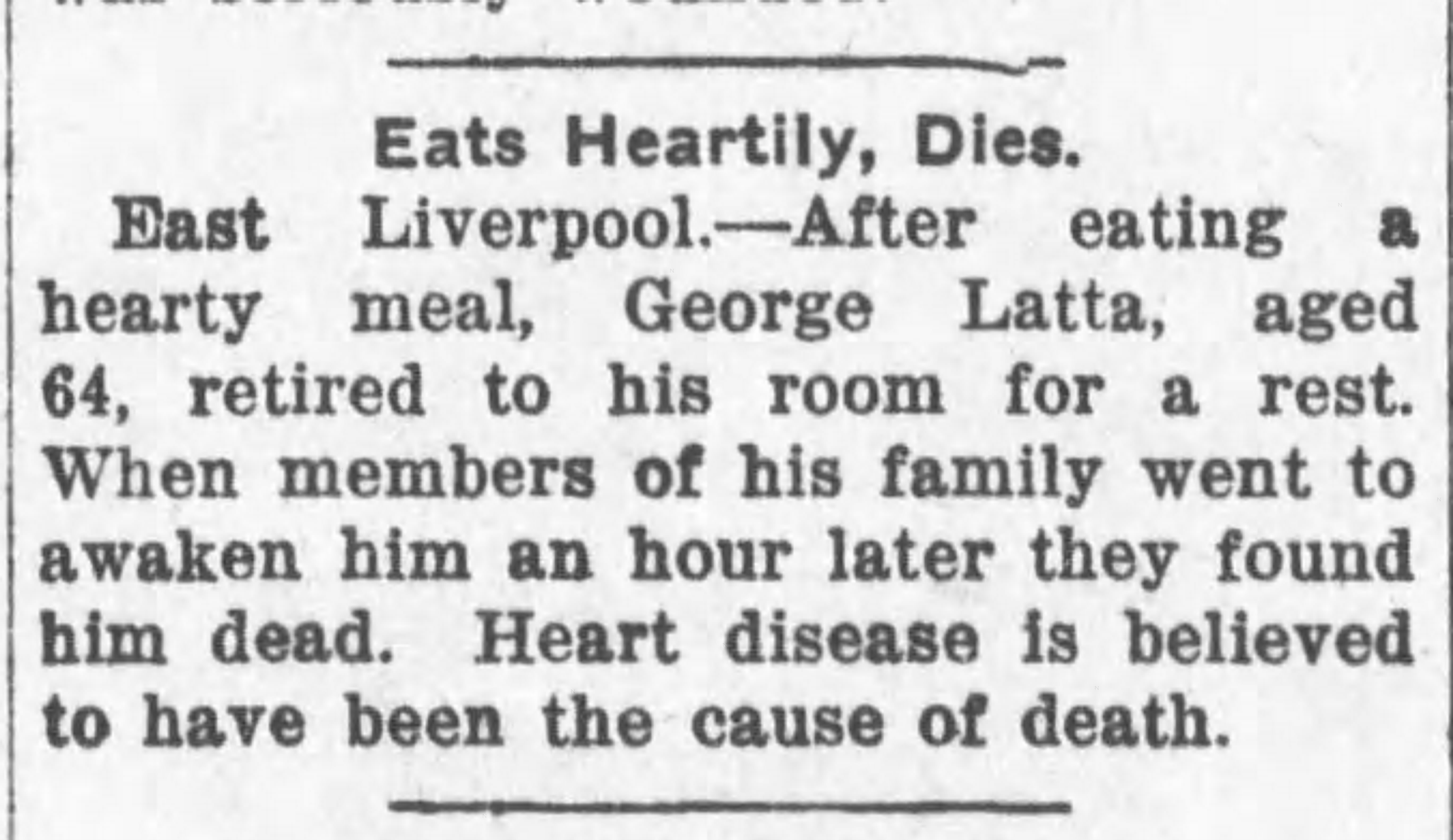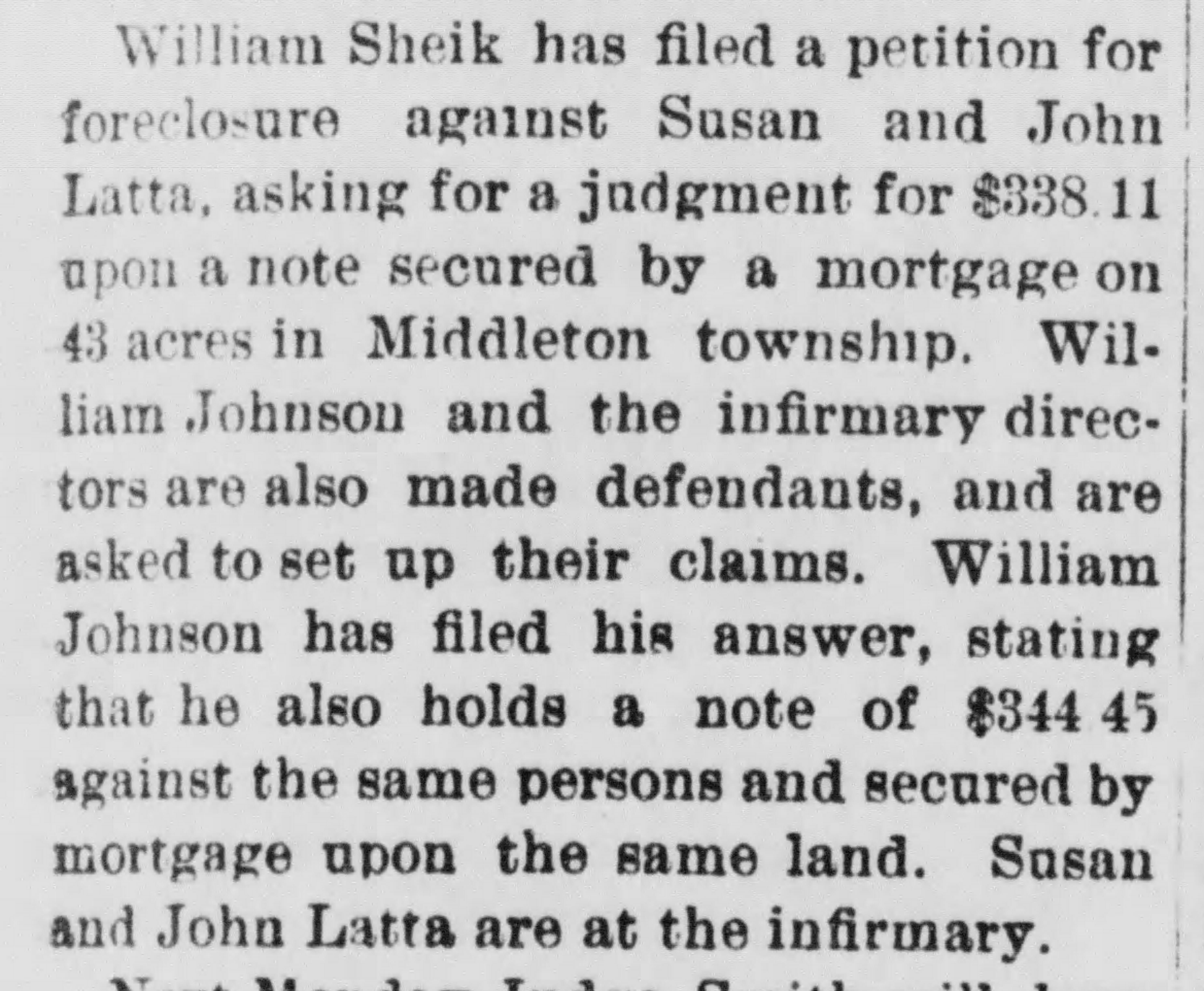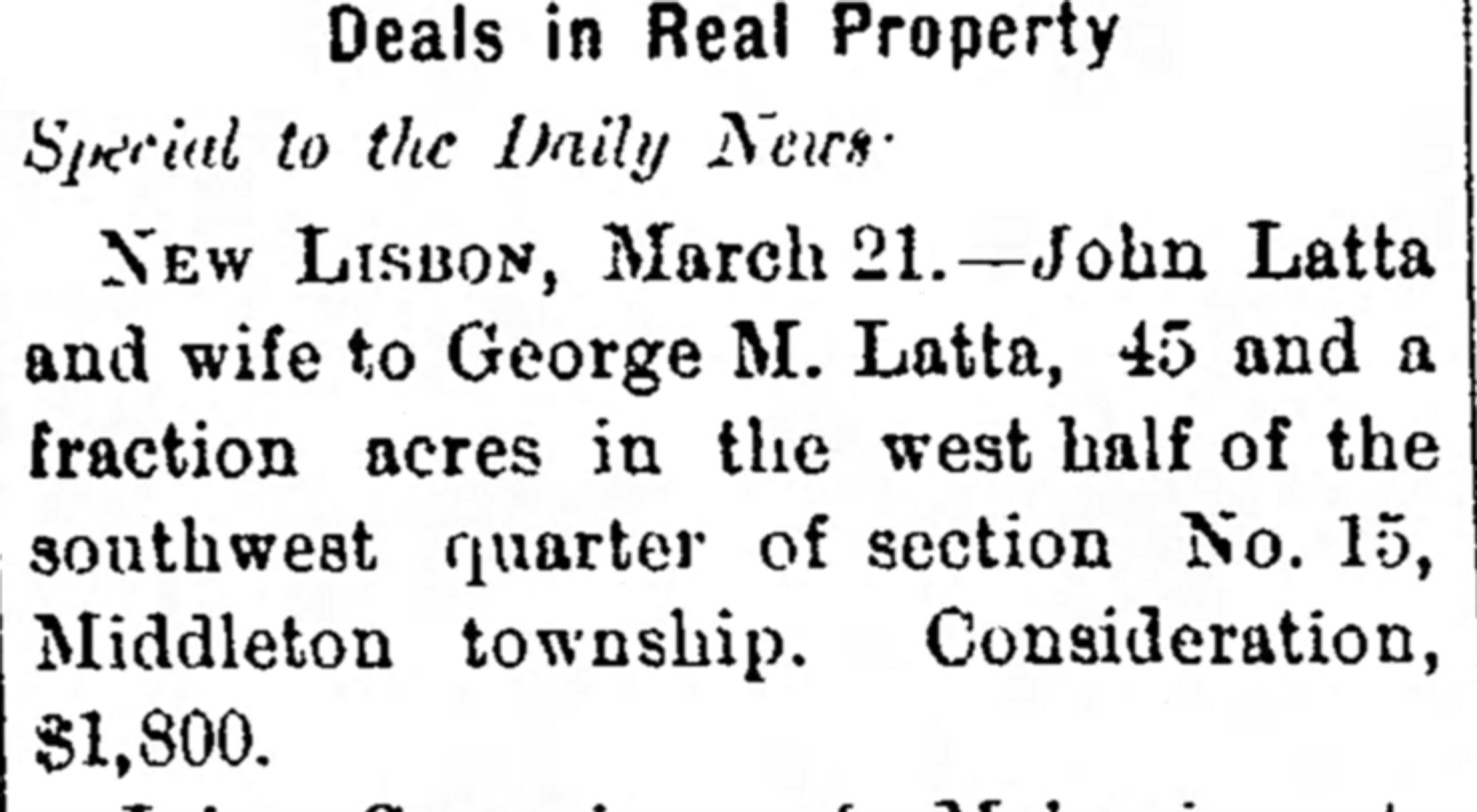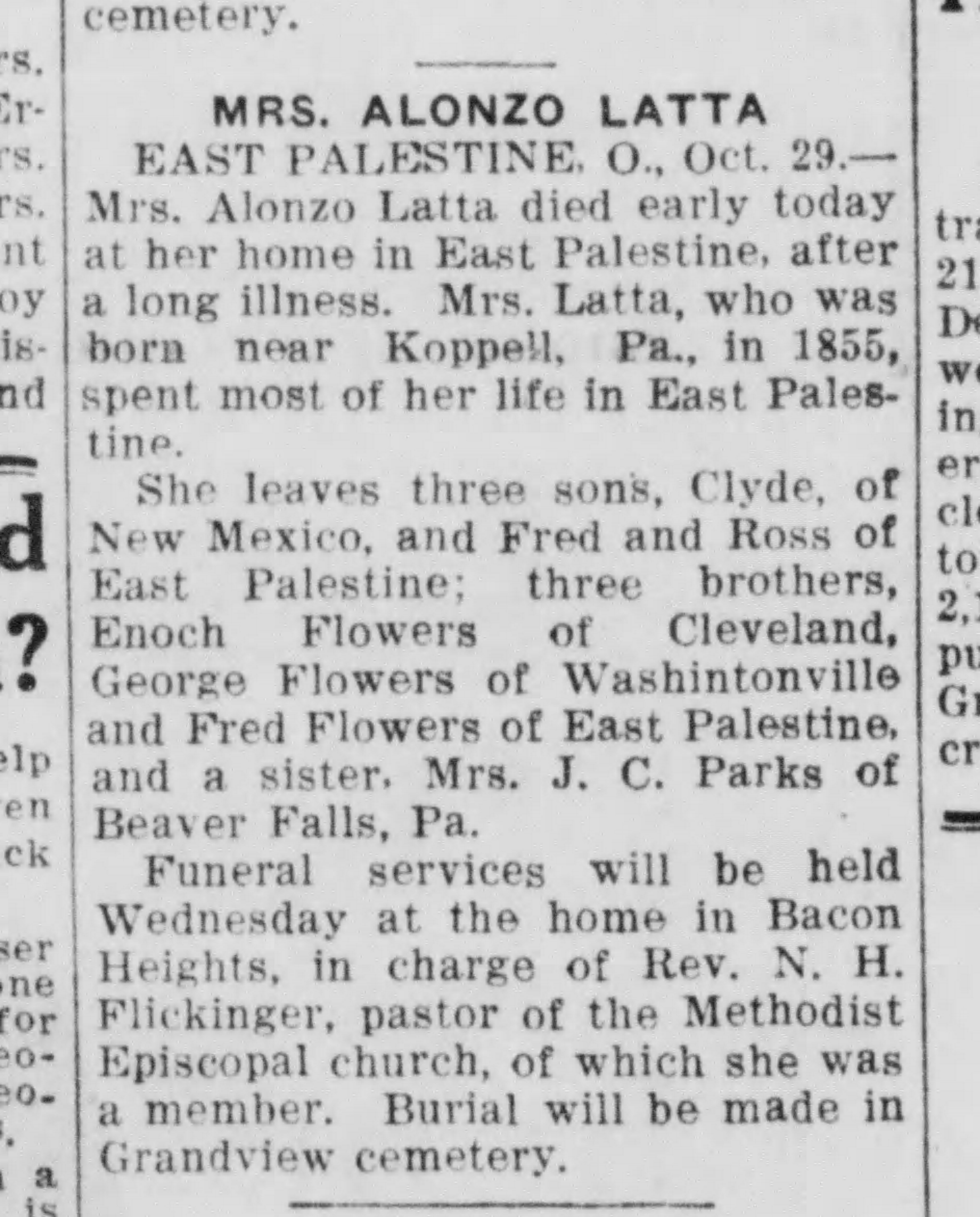 "History of the Upper Ohio Valley, Volume 1" page 276 - Ezra Latta, one of the enterprising business men of Unity Township, was born in Beaver County, Pennsylvania, being one of two sons born to John Latta and Mary (Rhinehart) Latta. The father was a Pennsylvanian. He afterwards located in Ohio, and later in Illinois, where he died. His widow again married and had six children by her second husband. She finally returned to Ohio, and died in Middleton township in 1875. The other son of her first marriage was John Latta. Ezra was educated in an old log school house, known as the New Ridge School-house. Subsequently, he learned the milling business, having been apprenticed to a man who operated a flour-mill at Old Falston, Beaver County, Pennsylvania. After completing his apprenticeship, he removed to Columbiana County, Ohio, and rented a mill of John Crum, which he operated for ten or twelve years, when he was obligated to abandon the business on account of failing health. At this time, Mr. Latta removed to Western Ohio, and thence to Michigan and Indiana, and for several years was located at Fort Wayne. In the course of time he returned to his old home, and finding that the mill had changed hands, decided to purchase it. The man who was operating the mill offered him one-third of the profits for his services, which he accepted. Subsequently, he engaged in farming, and has since continued in that vocation. In 1844 he married to Miss Mary Huesten (Houston), daughter of Abram and Mary Huesten, who at that time were residents of Ohio, but who formerly came from Virginia. Six children are the fruit of this union: Marion C., now of the State of Washington, Webster (deceased), Emma (deceased), Louisa, wife of Joseph Near of southwestern Kansas, and Alonzo Cooper, who lives with his father. Mr. and Mrs. Latta are valued members of the Methodist Episcopal Church of East Palestine, and are held in high esteem by their neighbors and friends.
