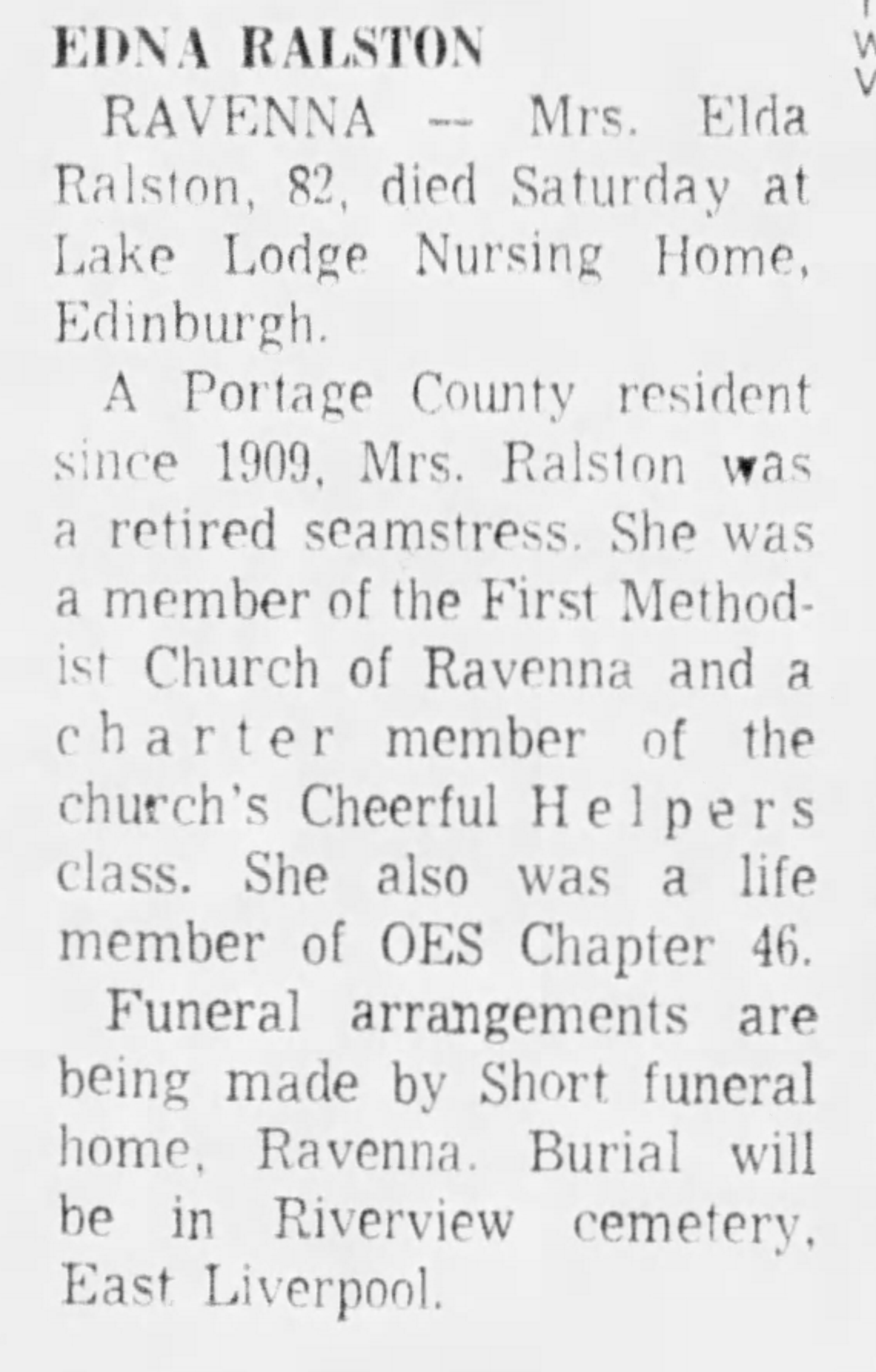 John Ross (4) Alonzo Cooper (3) Ezra (2) John (1) b. 1881; d. 1964; married Sylva Redick. Lived at E. Palestine, Ohio; buried in the Grandview Cemetery, East Palestine.