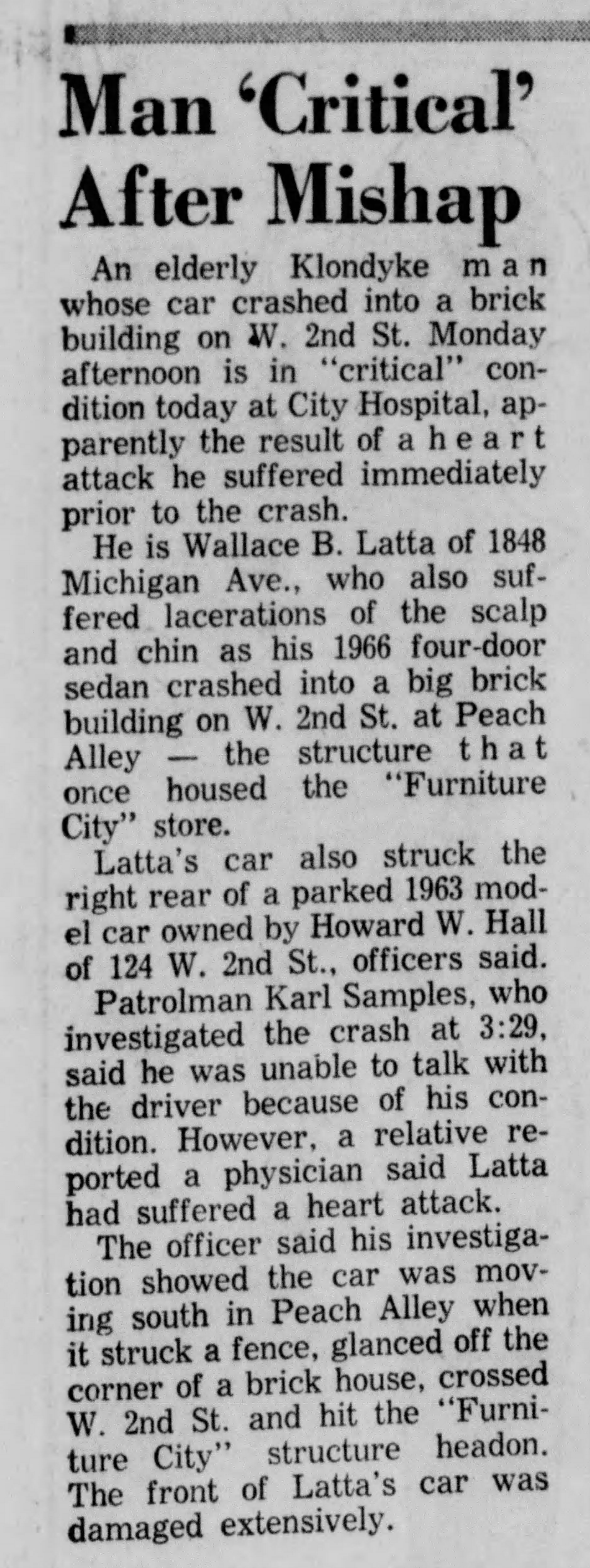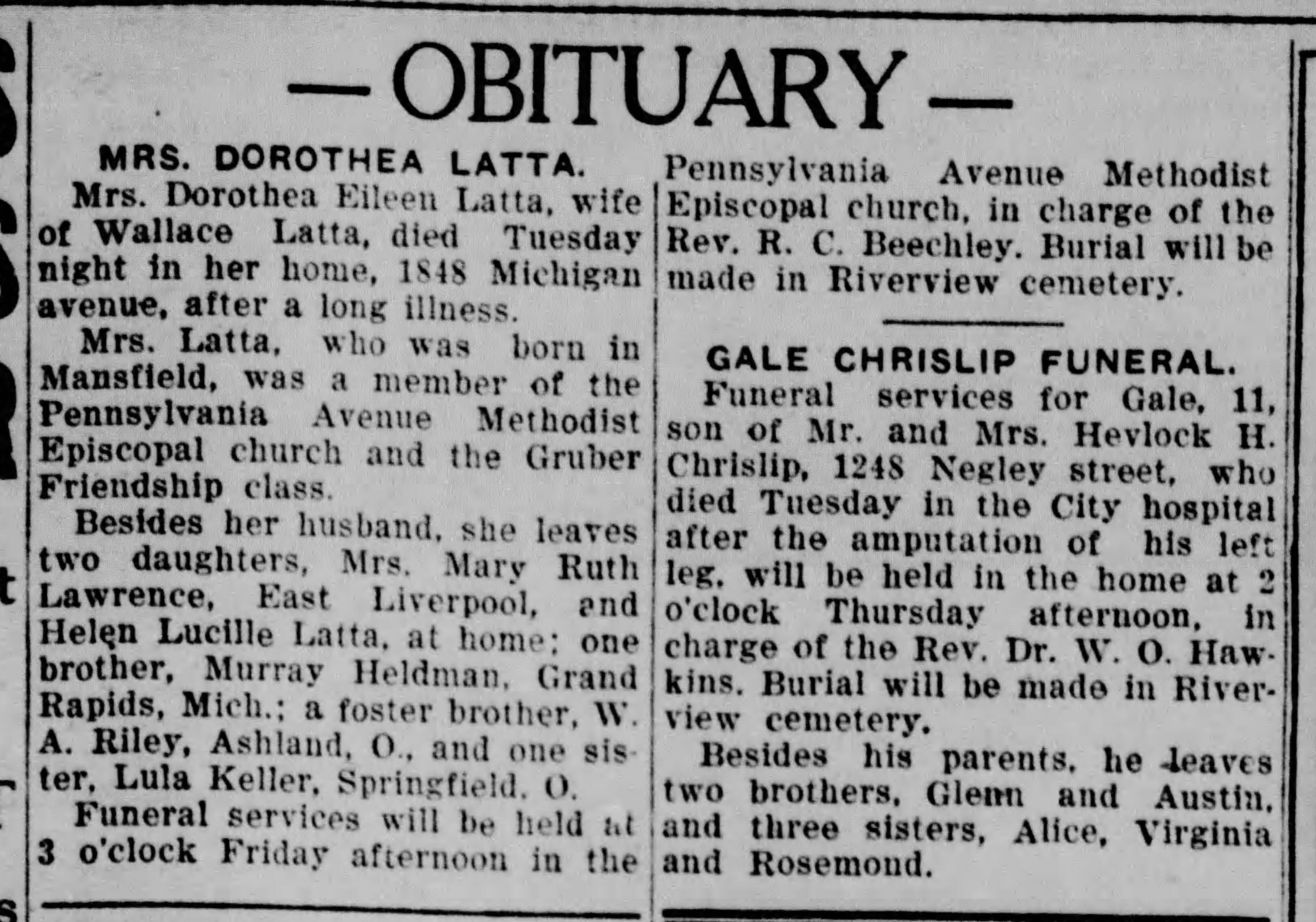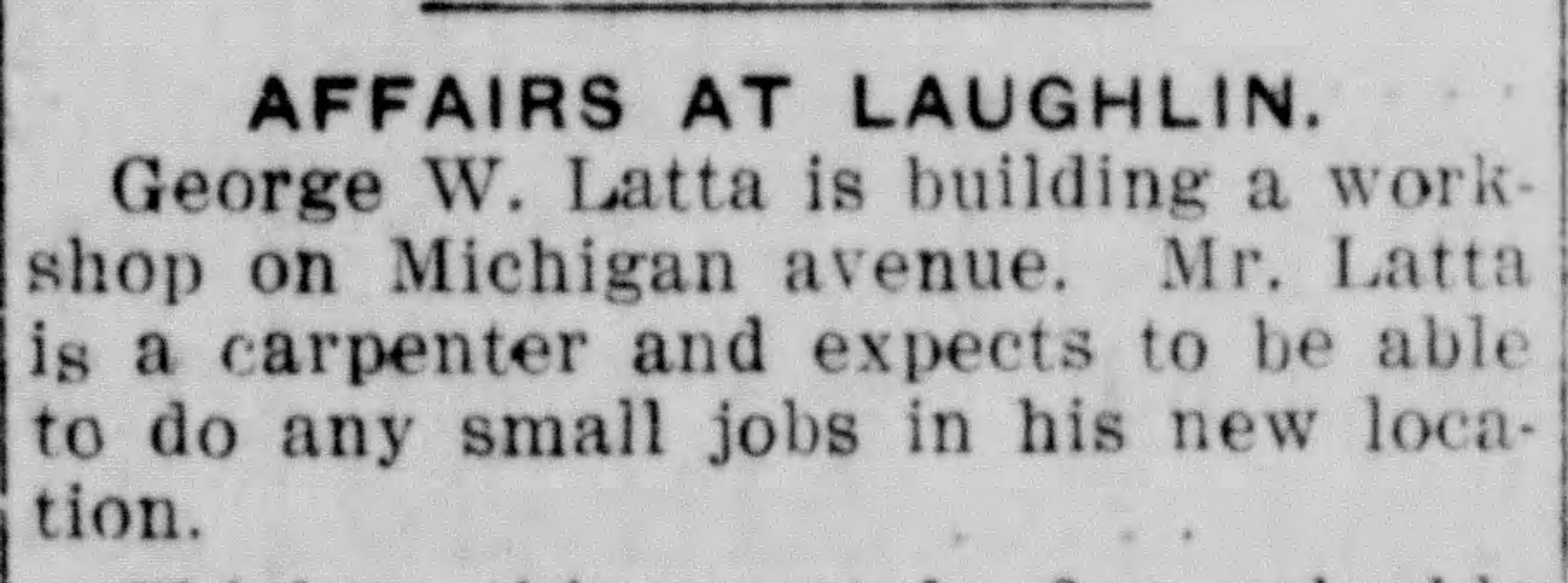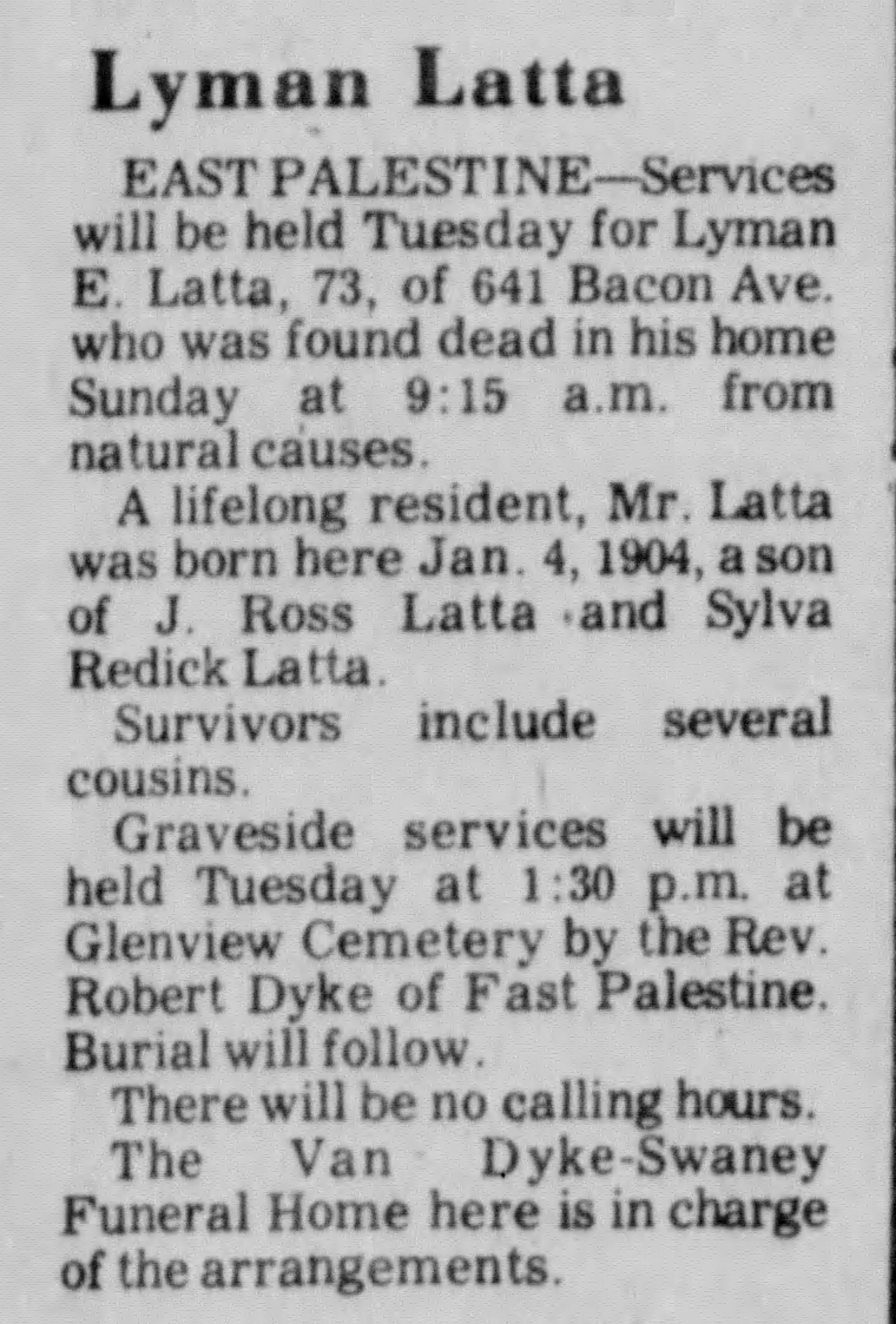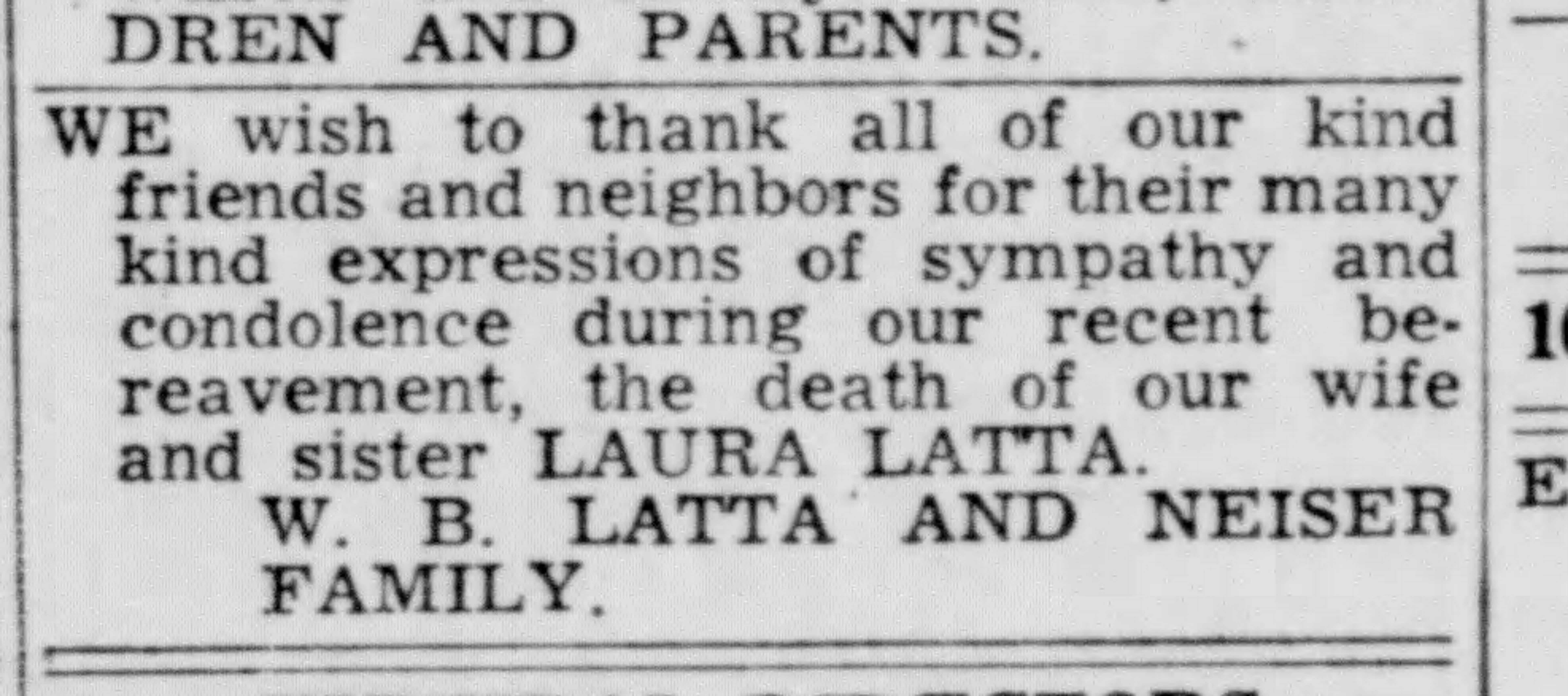 Wallace Burdette (4) George W. (3) John (2) John (1) Wallace Burdette Latta was born in 1889 and died in 1972. He married Dorthea Eileen Riley, who died in 1930. After her death, he married Laura Mae Neiser, a teacher. She died in 1957.