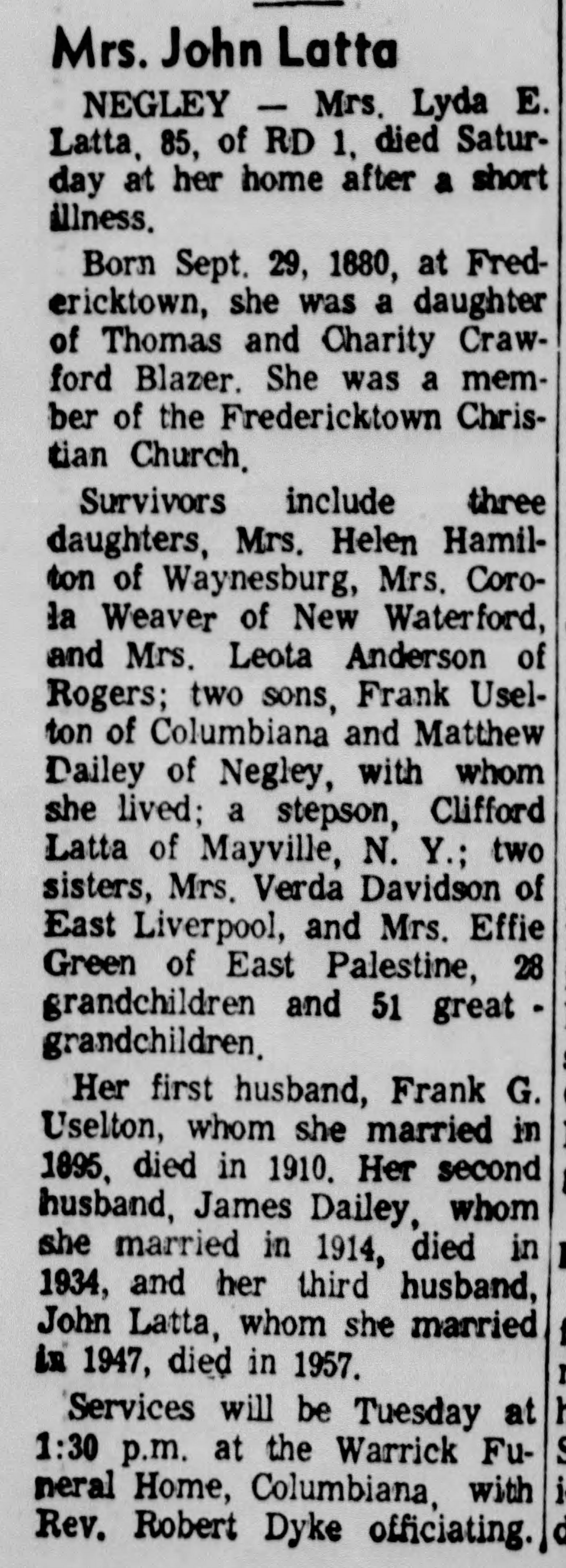 Mary Elizabeth Blazer Uselton Dailey. She was born in 1879 and died in 1966. John had a small store in Negley,