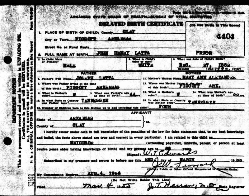 W S Latta, Bradshaw, Greene, AR 37 abt 1823