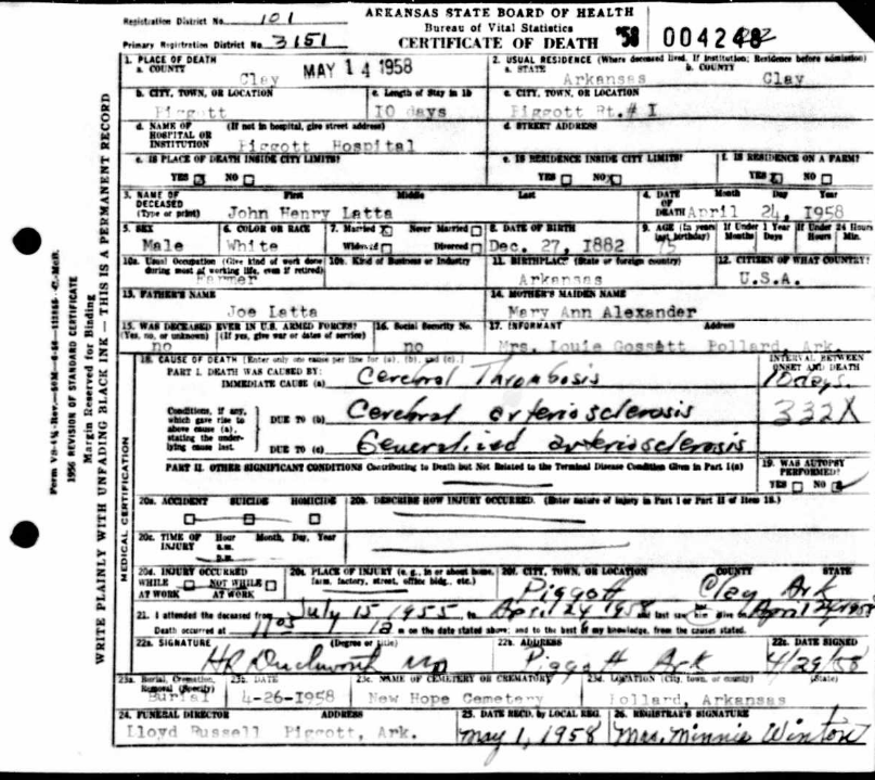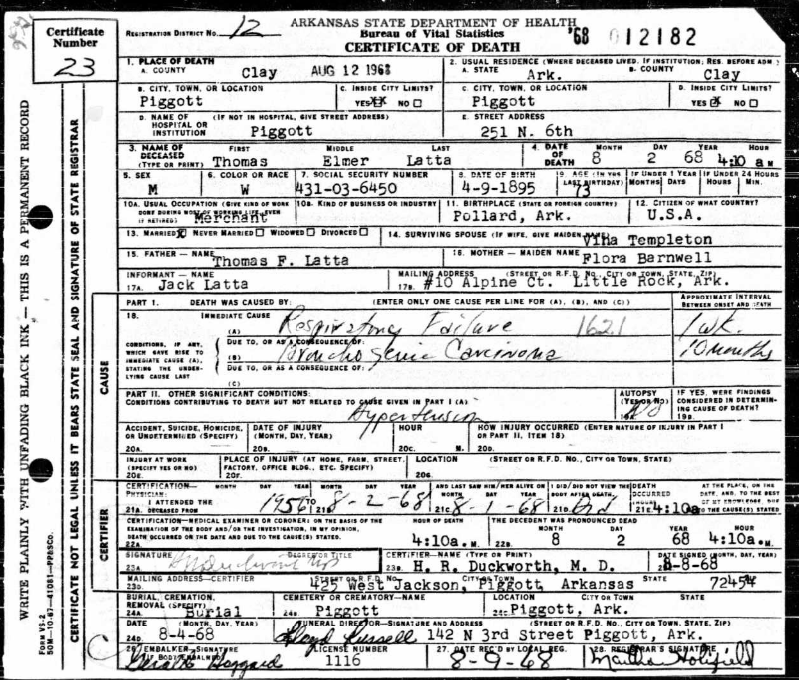 Clay Co., Ark. April 9, 1895; d. August 2, 1968 at Piggott, Clay Co.,