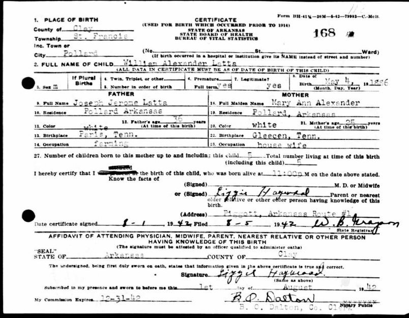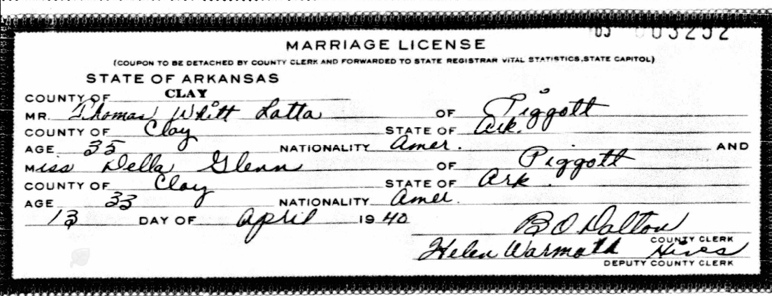 Clay County, Arkansas; m. Della Glenn on April 14, 1940 in Clay Co.,