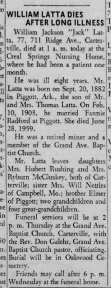 December 17, 1906; d. May 27, 1998 in Cartersville, Williamson County, IL. Twin with Jessie.