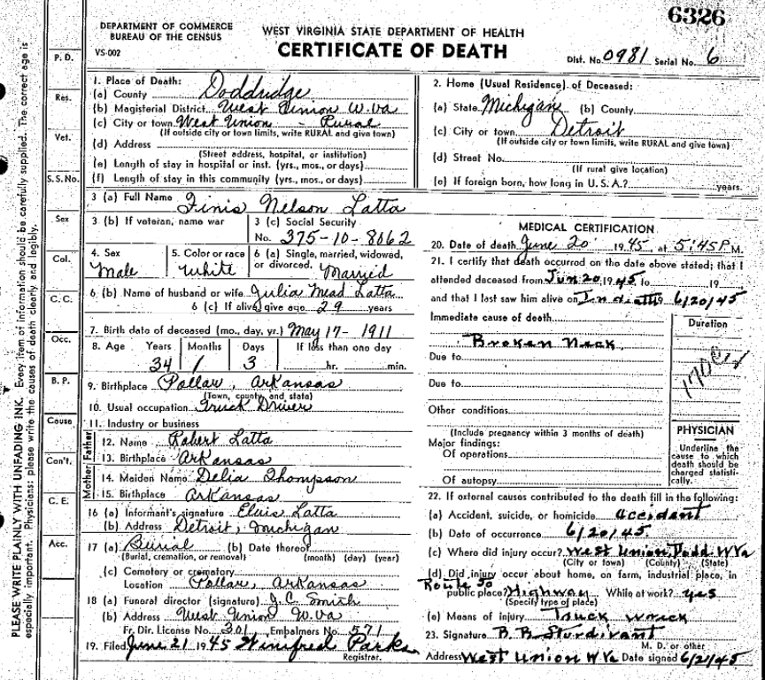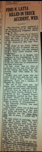 (1). May 16, 1911; d. June 29, 1945 when the tractor trailer that he owned was