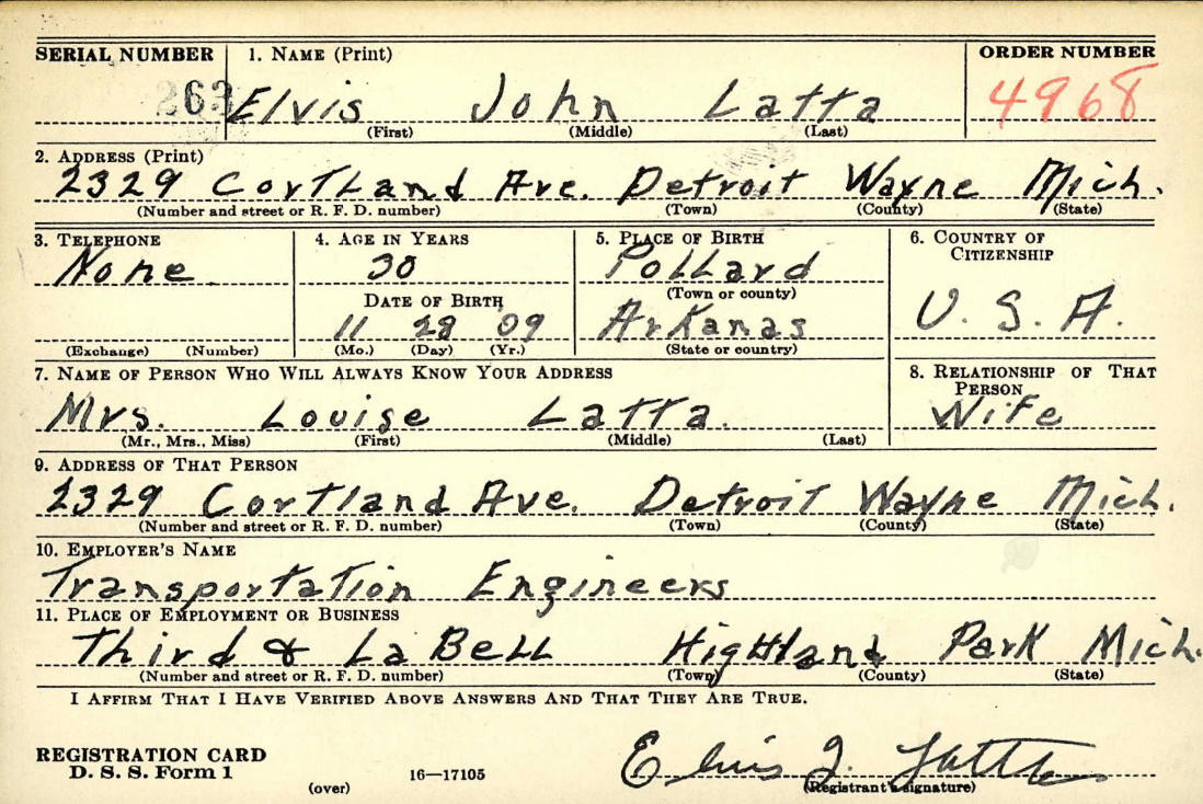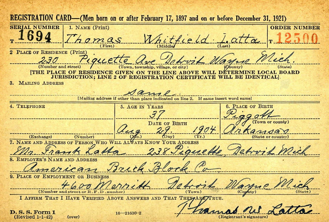 Arkansas. Living in Detroit, Michigan when he registered for the draft in