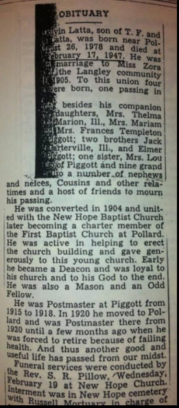 Fathers of the Ridge, Vol. III, Genealogical Sketches of Greene and Clay Counties - 1980........LATTA - William S. Latta was born in North Carolina in 1822. His wife, Bennetta, was born in Tennessee in 1826. In 1850 this family was living in Union County, Illinois and their children were: John, 1842, Susannah, 1844; and Joseph, 1848. John and Susannah were born in Tennessee, but Joseph was born in Illinois. By 1860 the Latta family had moved to Greene County and settled in Bradshaw Township. By this latter date five more children had been added to the household: A.E. (a daughter), 1850; W.1 (a son), 1852, Mary E., 1854; Thomas, 1857; and Sarah, 1859. A.E. was born in Illinois and W.1 in Tennessee. The three younger children were born in Arkansas. By 1870 William S. Latta and his wife, Olive C., were still living in Bradshaw Township and by this date three more children had been added to the household: Martha B., 1861; Audey L., 1864, and Eller Jane, 1869. William S. Latta is buried at the New Hope Cemetery in Clay County, Arkansas. His marker shows dates of 1821 and 1911. In 1850 the Spencer Laws family was living in the same neighborhood with the Latta family in Union County, Illinois (see LAWS, Vol. III)