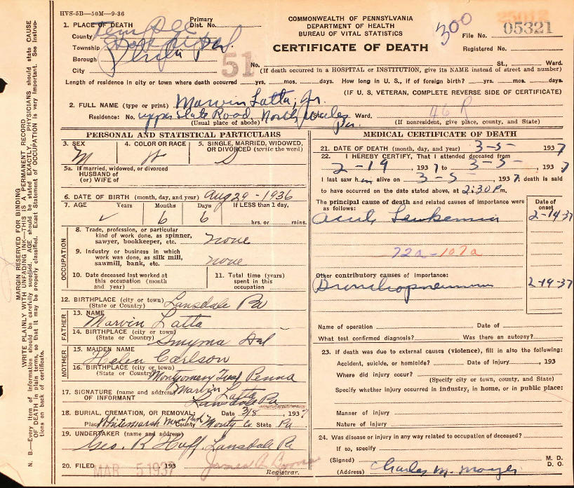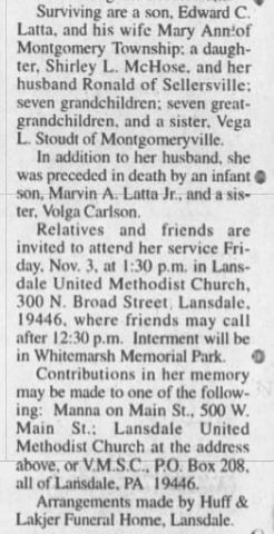 William Aubrey (4) John A. (3) John S. (2) John S. (1) b. October 6, 1922 at Lansdale, Pa.; d. Jan, 1986 in Lansdale, PA (SS Index).