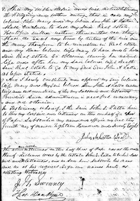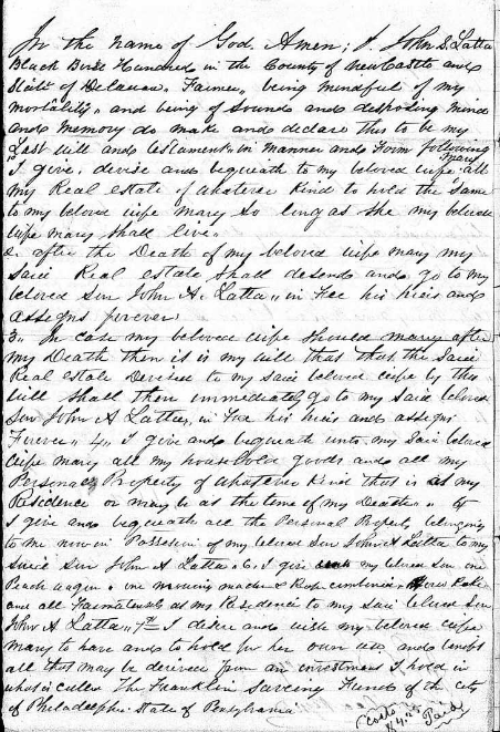 Last Will & Testament of John S. Latta - New Castle, Delaware, 1878