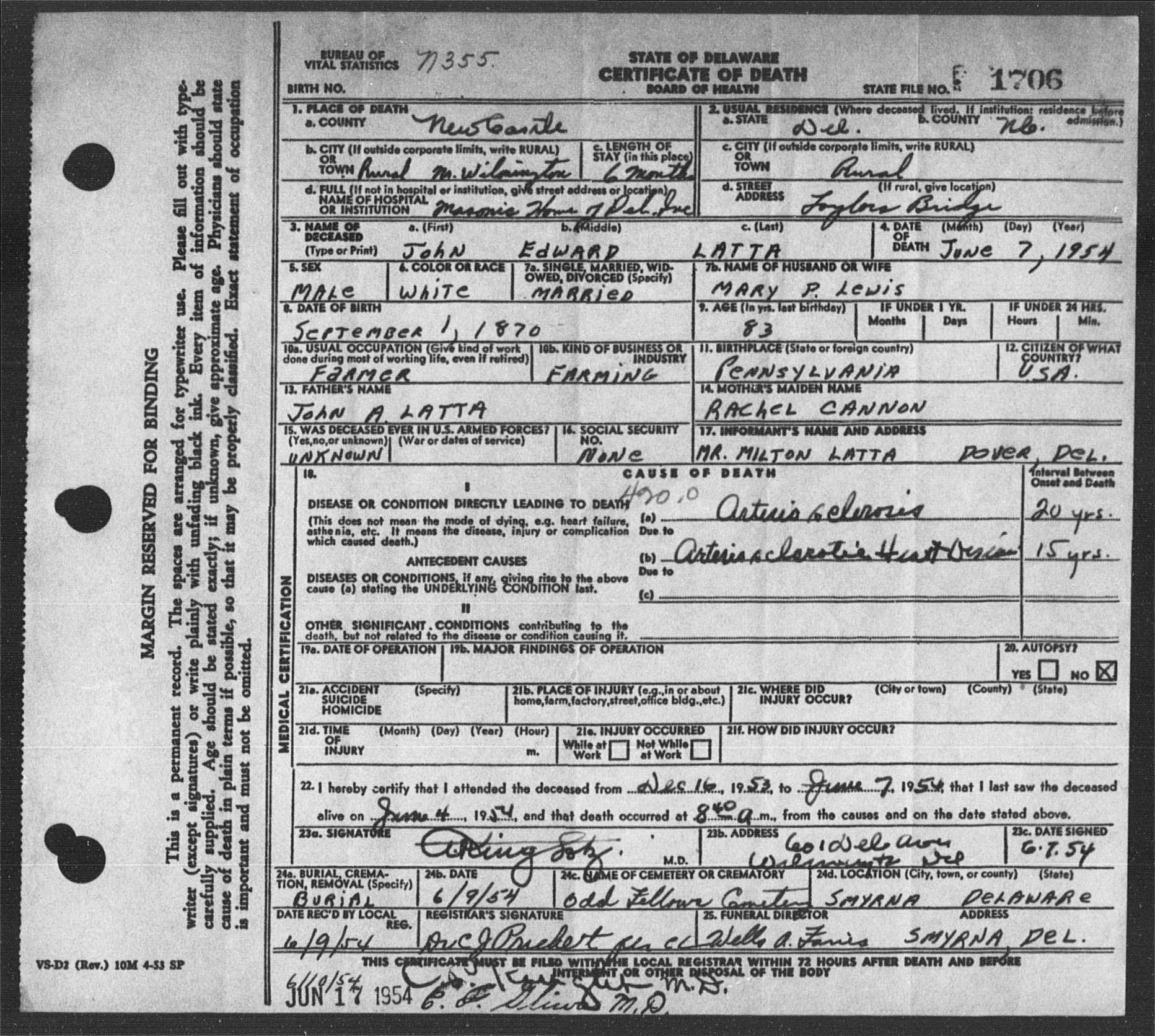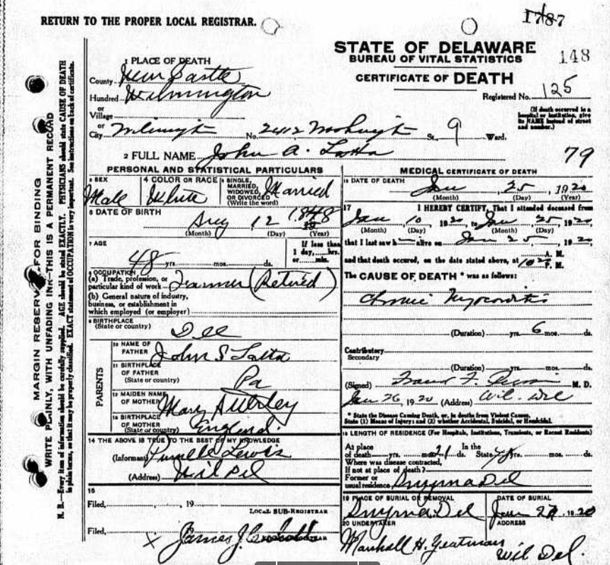 June 7, 1954 in Delaware; m. Mary B. Lewis. She was born in 1872 and died in