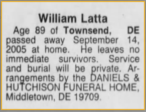 at Smyrna, Del. Twin with John A.; single, never married; died Sept. 14, 2005 in