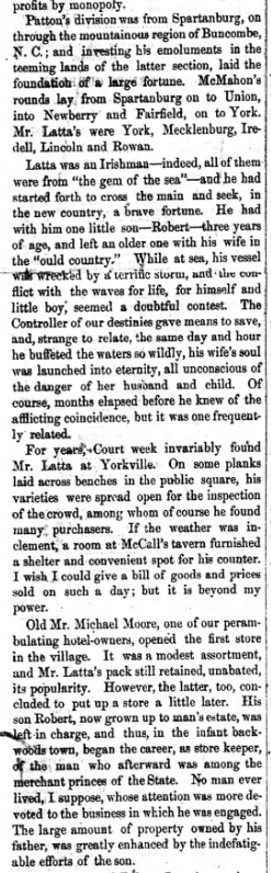WILL OF ROBERT LATTA (Rowan Co., NC Will Book A, page 171-173) executed June 30, 1780, proved Nov. 7, 1782 and settled according to Rowan Co. Court Records, Feb. 12, 1785. Robert Latta, late of Kingdon of Ireland...now living in Mecklinburg (sic)...weak and low condition....my beloved wife Jane Latta 3,000 pounds Continental money - 20 pounds in hard money - eight shillings to the dollar...beloved son James Latta 400 pounds hard money of same value...my youngest son Samuel my land and tenements...the premises known as Kelenie in Parish of Donahadie (sic) and Co. tyrone in Kingdom of Ireland he giving my wife Jane a comfortable subsistence off the same during her life...also half my cattle and horses and my son James the remaining half....daughters Jane and Agnefs (sic) so much in money as make them equal with the portion I gave Isabell...remains of estate to be equally divided among my children....Exor's: Robert Ramsey and James Kerr of Rowan Co. & Thomas Bartley, late of City of Philadelphia. Witnesses: Margaret Givens and James Kerr.