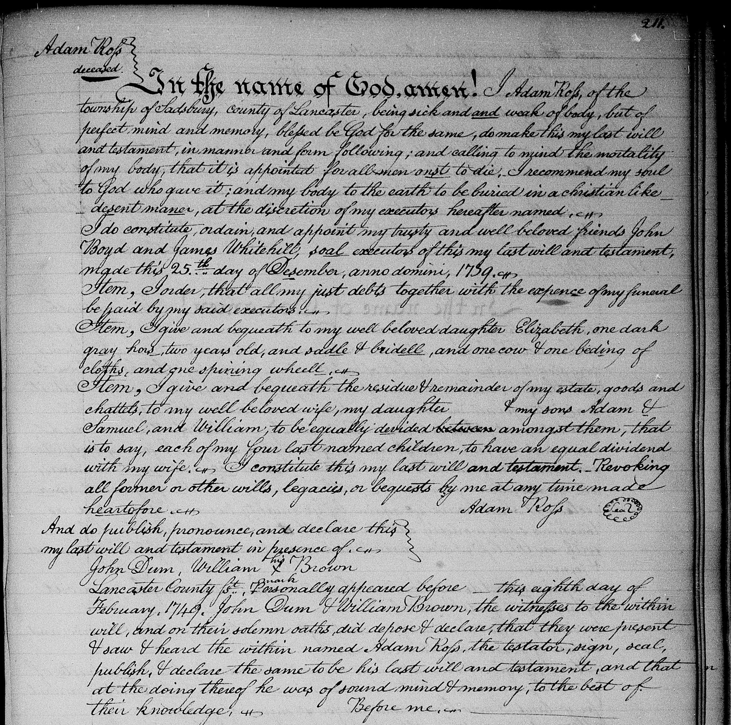 a daughter Elizabeth. Adam Ross died in 1749. (Will Book J, page 211) Adam