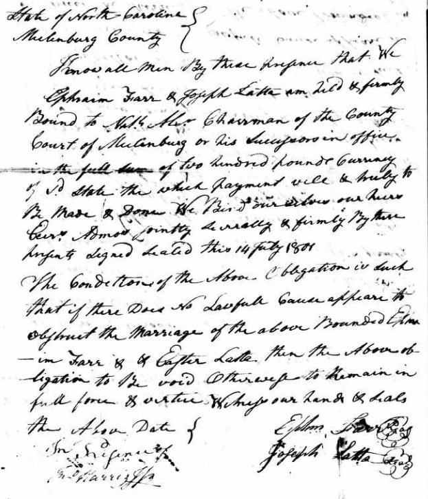 (3) b. about 1777 , married Ephraim Pharr (record spells it "Farr") in Mechlenburg Co., N.C. July 14,1801