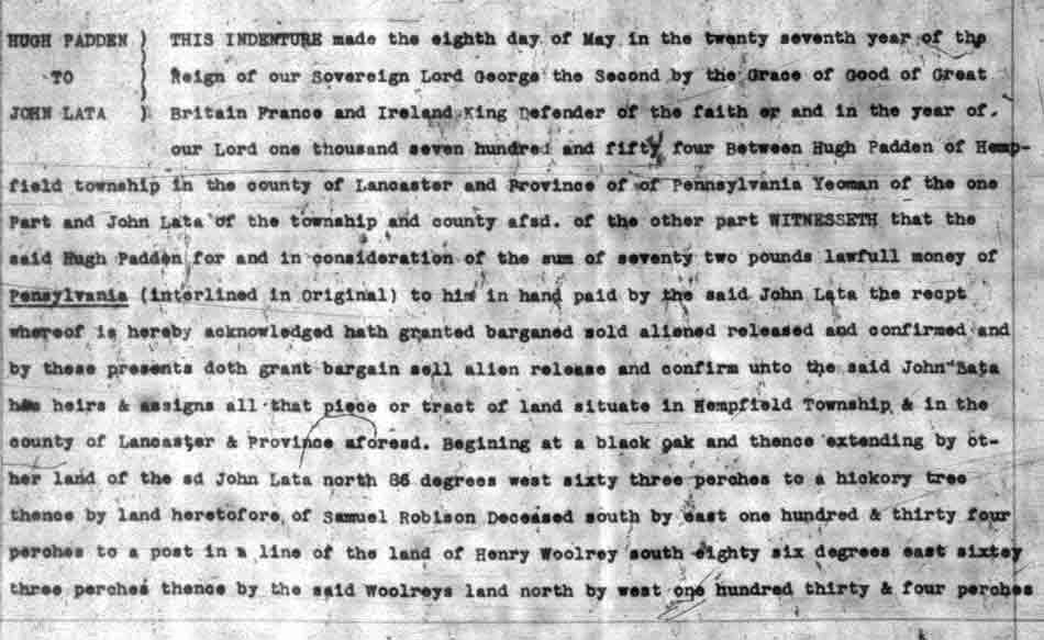 John Lata then bought Samuel Robison's tract of land beside him from Hugh Paden in 1754.