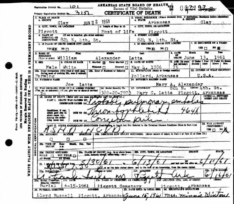 Thomas F. (3) William S. (2) John (1). Born near Piggott,