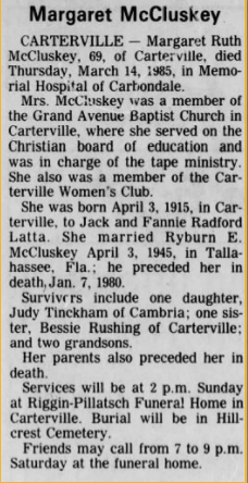 April 3, 1915; d. March 14, 1985; m. Ryburn E. McCluskey on April 3, 1945 in