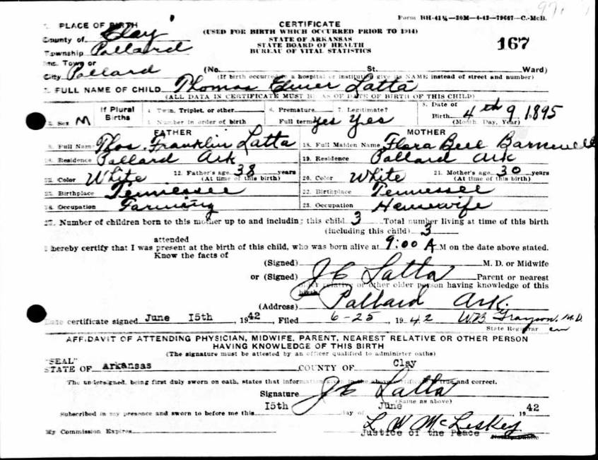 Clay County, Arkansas; m. Della Glenn on April 14, 1940 in Clay Co.,