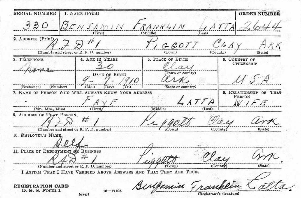 Bank in Piggott, Arkansas, when he registered for the draft during WWII.