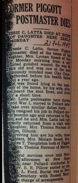 Fathers of the Ridge, Vol. III, Genealogical Sketches of Greene and Clay Counties - 1980........LATTA - William S. Latta was born in North Carolina in 1822. His wife, Bennetta, was born in Tennessee in 1826. In 1850 this family was living in Union County, Illinois and their children were: John, 1842, Susannah, 1844; and Joseph, 1848. John and Susannah were born in Tennessee, but Joseph was born in Illinois. By 1860 the Latta family had moved to Greene County and settled in Bradshaw Township. By this latter date five more children had been added to the household: A.E. (a daughter), 1850; W.1 (a son), 1852, Mary E., 1854; Thomas, 1857; and Sarah, 1859. A.E. was born in Illinois and W.1 in Tennessee. The three younger children were born in Arkansas. By 1870 William S. Latta and his wife, Olive C., were still living in Bradshaw Township and by this date three more children had been added to the household: Martha B., 1861; Audey L., 1864, and Eller Jane, 1869. William S. Latta is buried at the New Hope Cemetery in Clay County, Arkansas. His marker shows dates of 1821 and 1911. In 1850 the Spencer Laws family was living in the same neighborhood with the Latta family in Union County, Illinois (see LAWS, Vol. III)