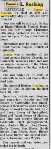 December 17, 1906; d. May 27, 1998 in Cartersville, Williamson County, IL. Twin with Jessie.