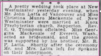 Canada; m. Christina Munro MacKenzie September 15, 1909 in New Westminster,