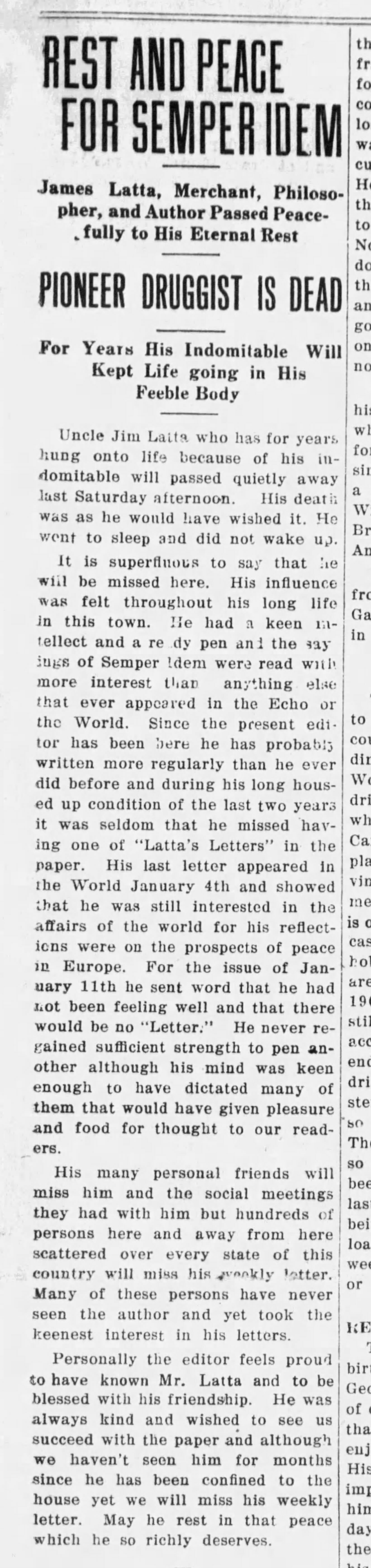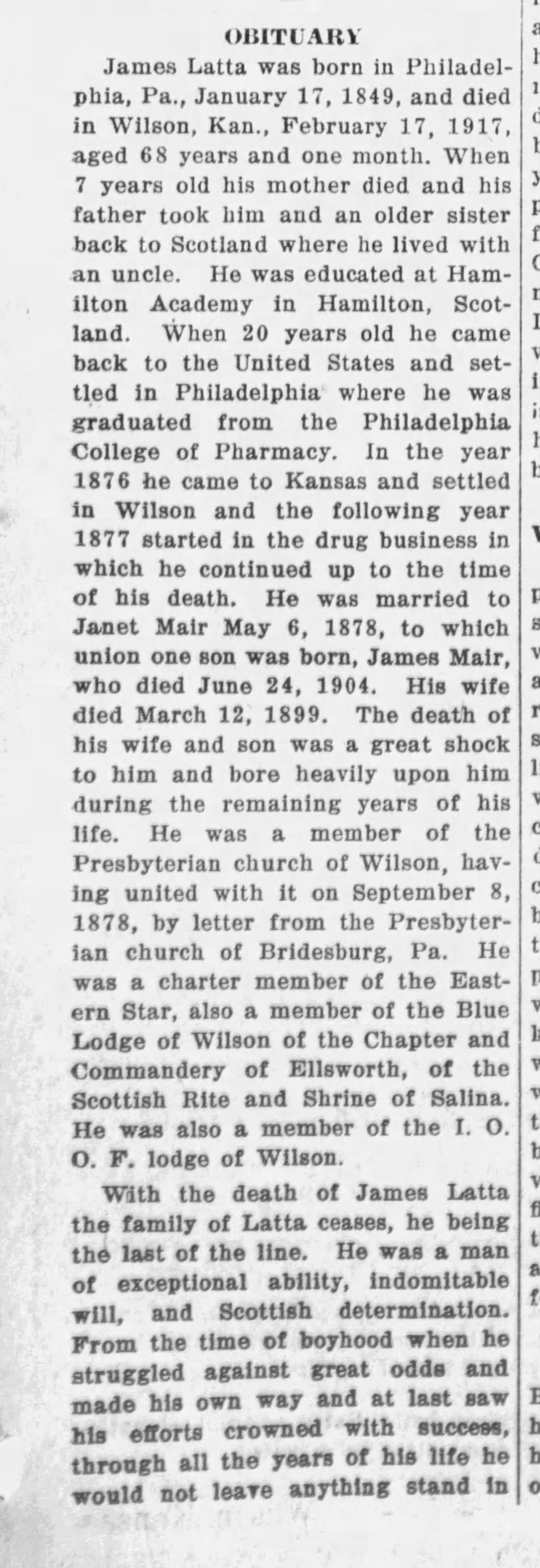 Kansas Pharmacy Board - Ellsworth, Kansas, Sept. 6 (1900). "At the meeting of the third quarter, held by the Kansas Board of Pharmacy, at Pittsburg, September 5. 35 applicants were present and took the examination. The following were successful....There were registered without examination, by virtue of being graduates of recognized colleges of pharmacy.....Thomas Mair Latta, Wilson...."