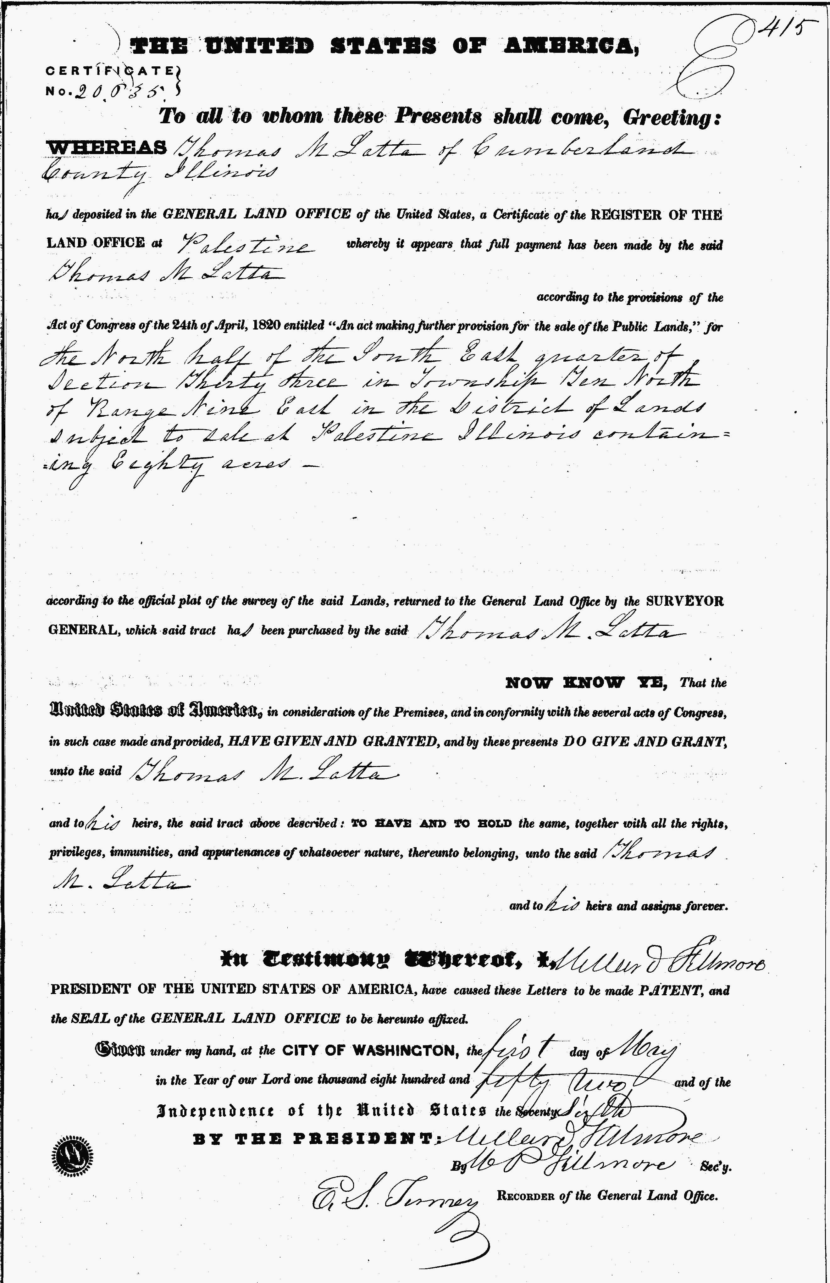 granted a tract of land in Illinois in 1852 shortly before his death. Thomas Latta